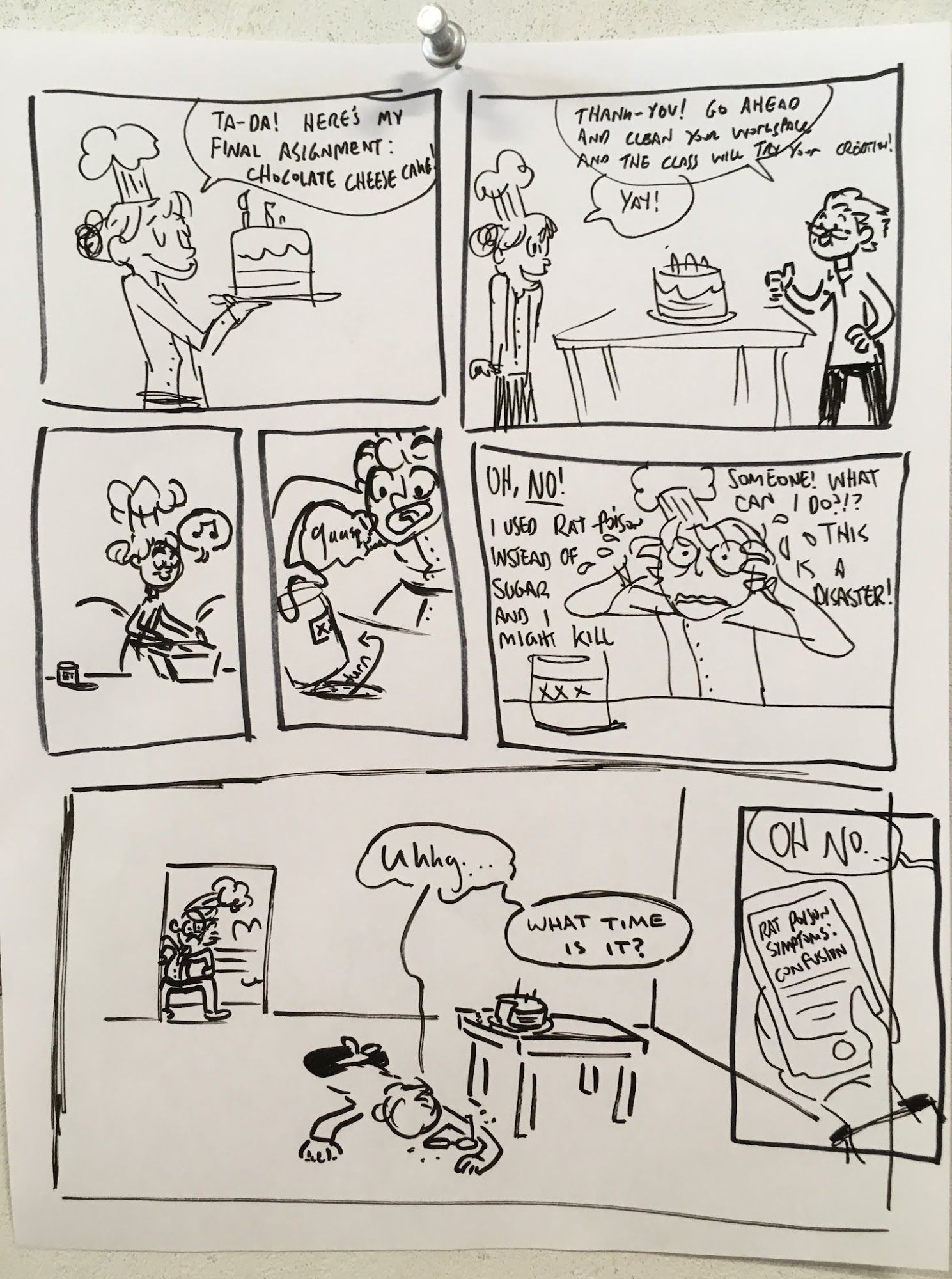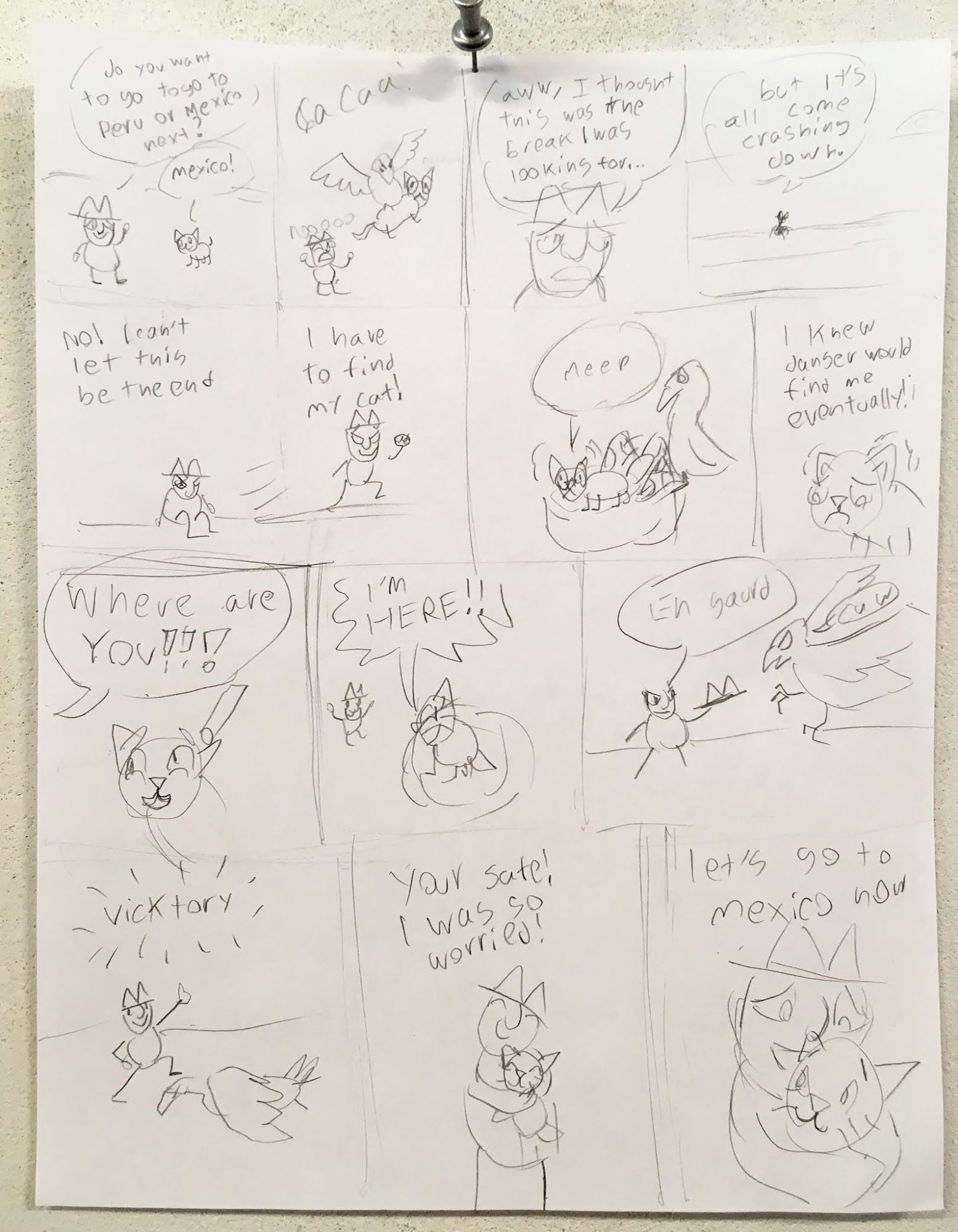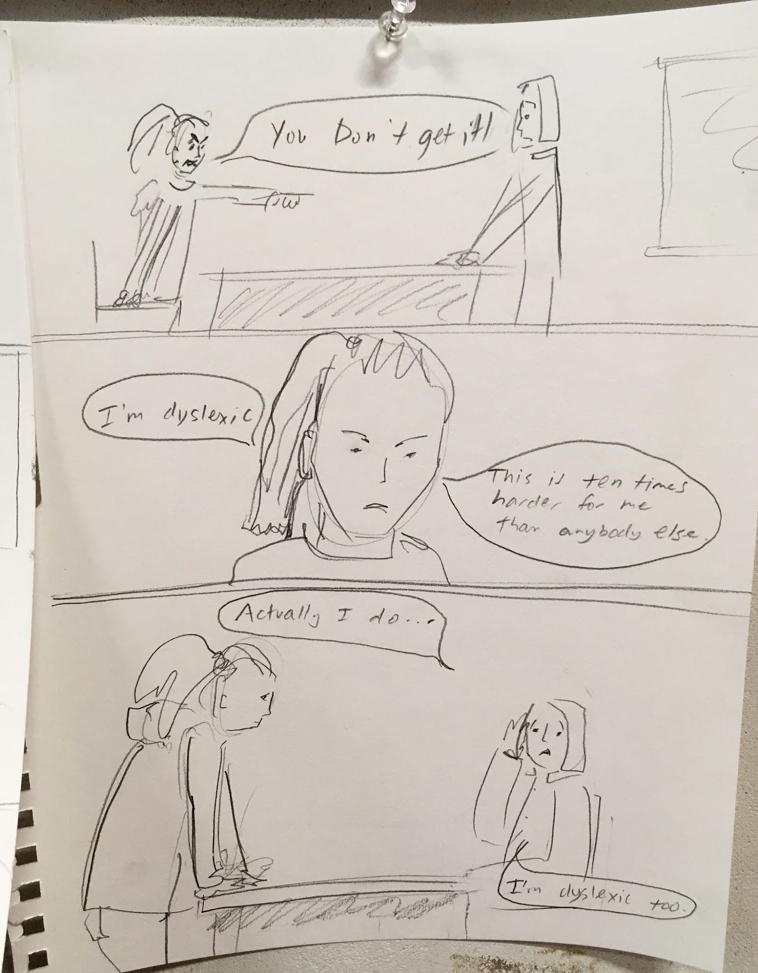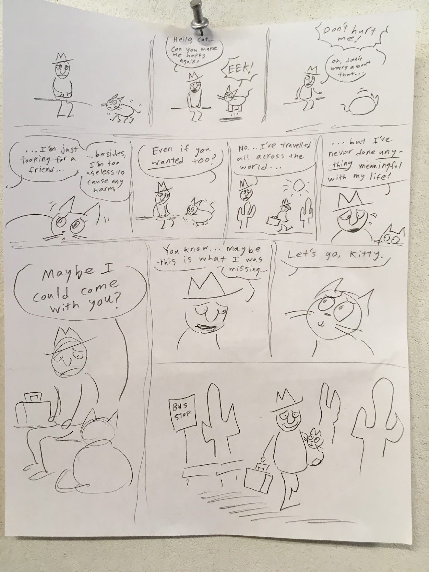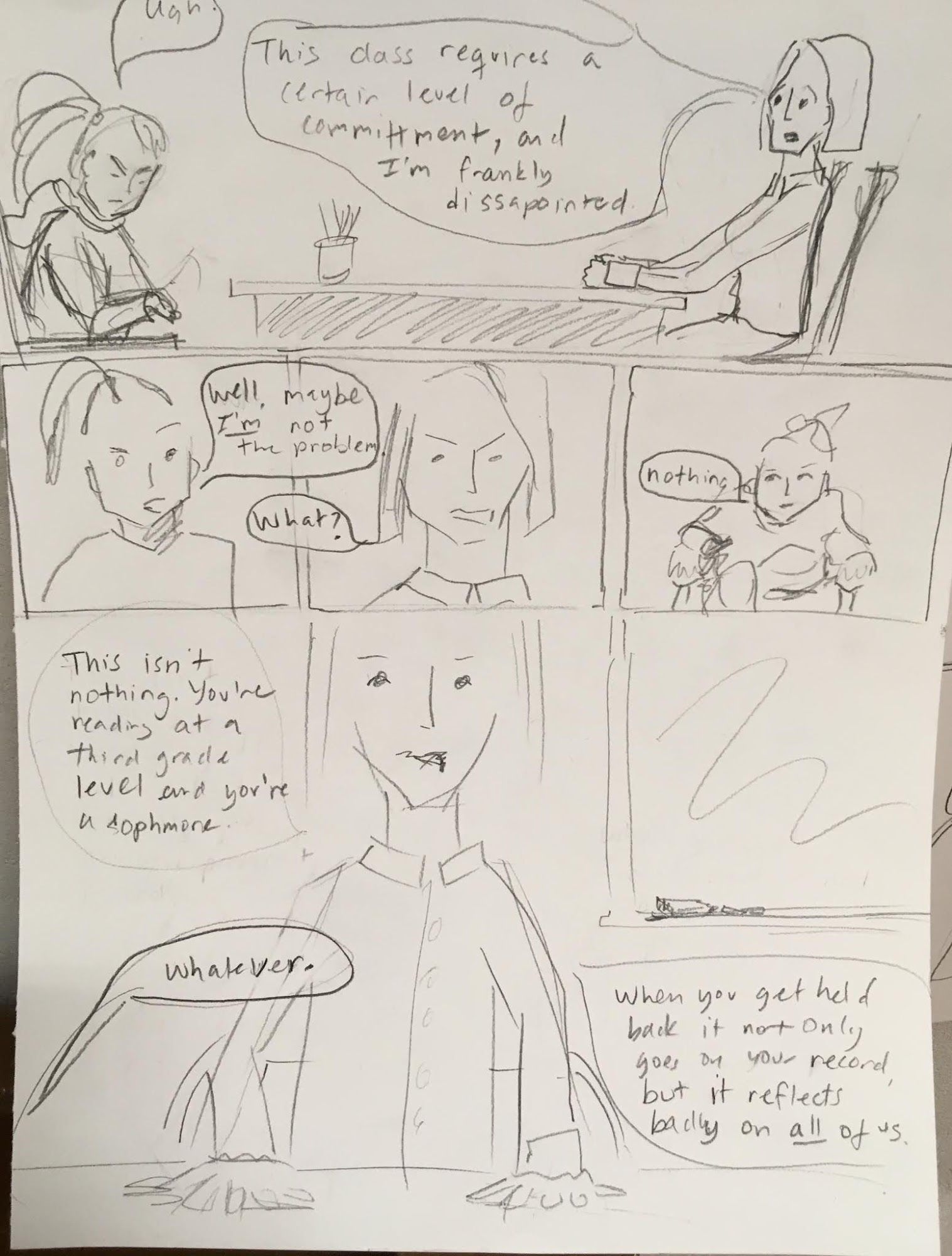 Today's in-class exercise was about Dialog. We were paired up and given two characters and commanded to create a comic that used dialog to show the characters interacting and changing in some way. Part of the challenge was brainstorming and working with another person!