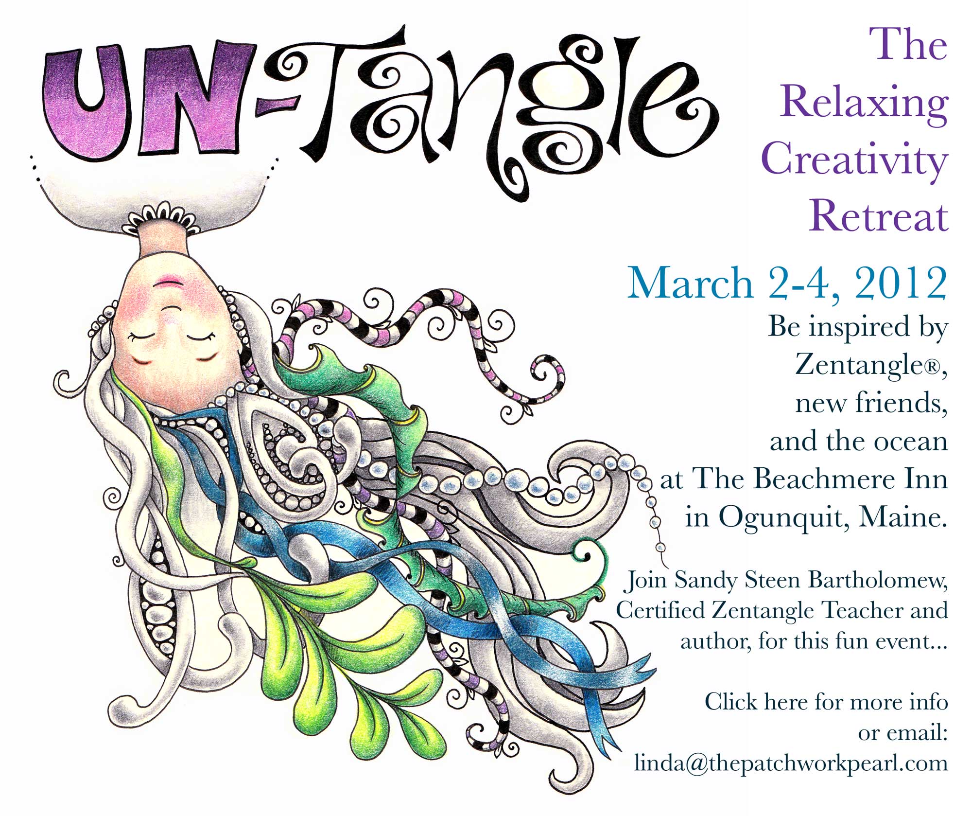Yeah! A whole BUNCH of people have signed up for UN-Tangle!!! It's filling up (don't miss out!) Linda actually contacted The Beachmere to reserve another block of rooms. Don't freak out though - we didn't decide to accept a ton more people - it's because a lot of people actually want single rooms. I admit that I always choose a single too, when there is a choice. It is nice to be able to recharge on your own. Sounds like there are a few day-trippers too. If you are thinking about coming to UN-Tangled, but have questions, please email me or Linda Pearl (she's doing all the left-brain stuff).