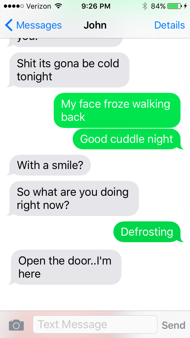 I went back to the tv and lasagna. When I went to put the dish in the sink and turn off the tv, I heard the text buzz again.