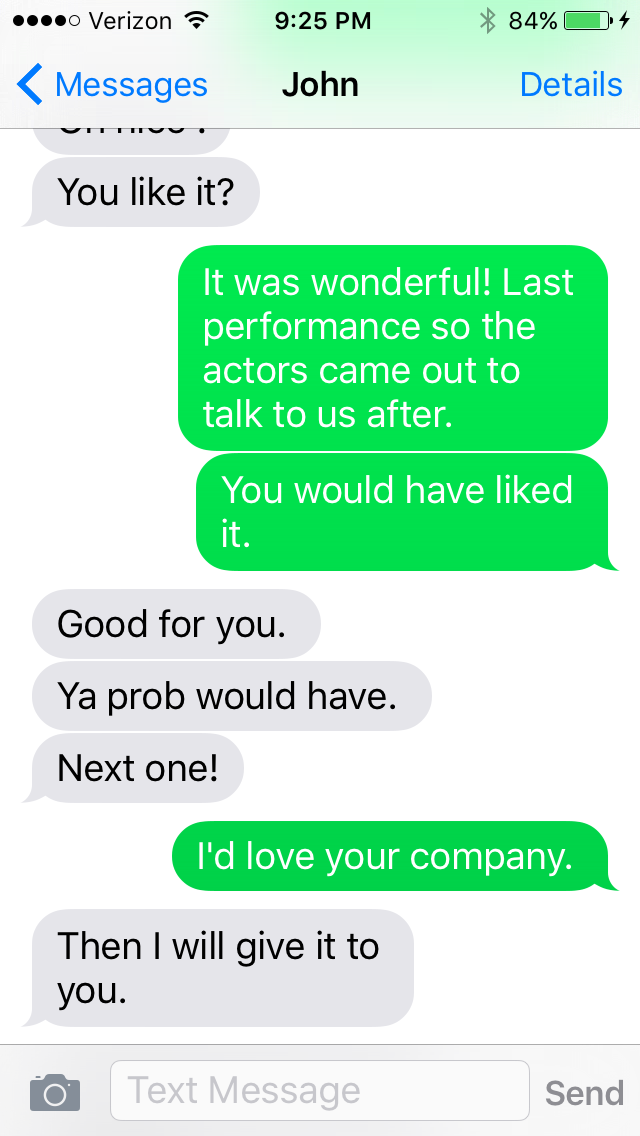 I had tax and legal papers spread all over the floor. (You can picture this, right?) The phone was re-charging in the other room. I was annoyed (only a little) to have to keep getting up from the couch (i.e., moving the cat) to see what he was texting me.