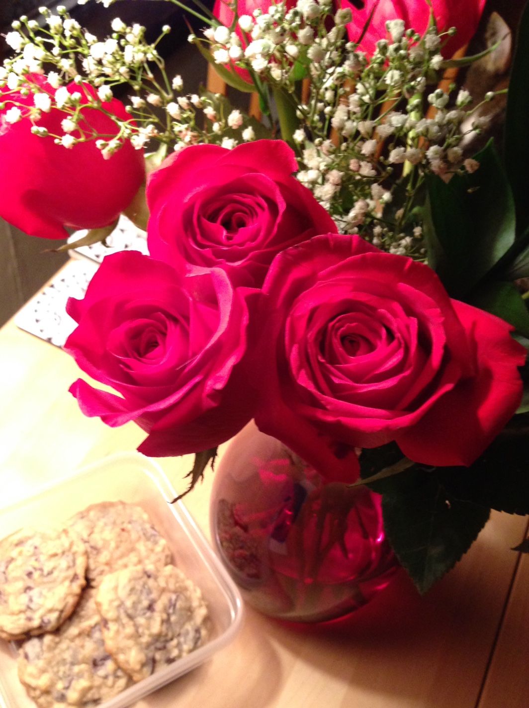 "Open the door... I'm here"What????! So I went over and opened it...HOLY S@#T! He was standing there with red roses and cookies!!! And he smelled so nice. :-)He'd even brought me a beautiful vase from the antique store because he knew I wouldn't have something to put flowers in at the apartment. Oh - and he had made the cookies fresh, with giant chunks of dark Ghirardelli chocolate...