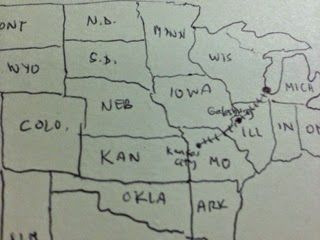 Maybe some of the states are recognizable? What's really cool is tracking it using the iPhone's Map App! Yes, it has a use! When the kids ask "where are we?" I can say with all authority, "this is Galesville, Illinois. Oops, you missed it!"