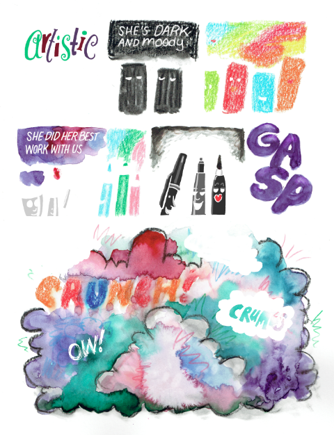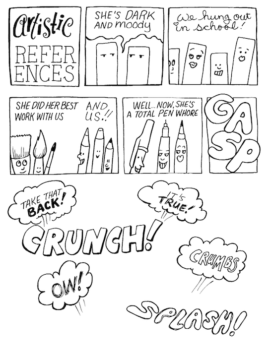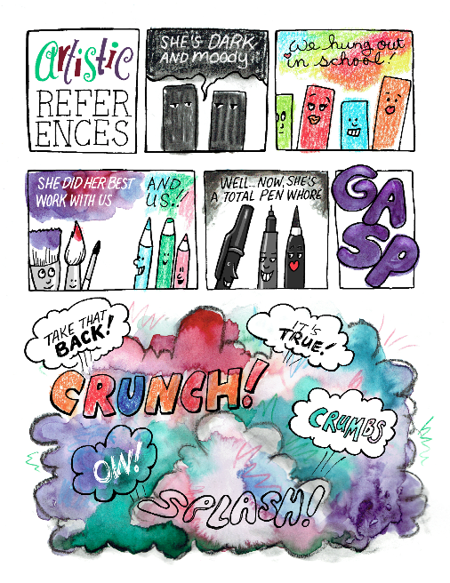 I had a funny vision of my relationship to art supplies and wanted to use the actual supplies to create the comic. I thought you might enjoy seeing the thoughts behind the comic!
