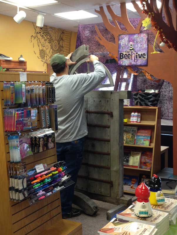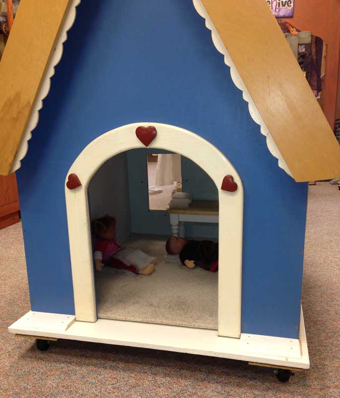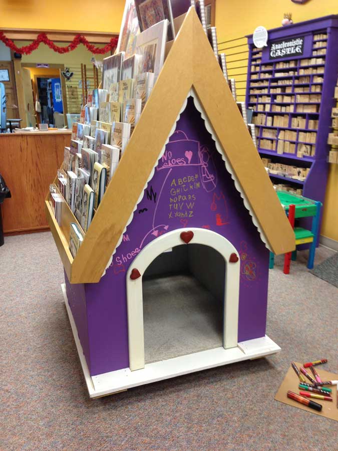 In the process of cleaning out the store room and the attic, I found some cool stuff - the best being the front and back of our A-frame display. The display was actually a "house" from a childrens' bookstore in Concord that closed when we first moved up here. Dan Hamilton put it back together for me and built new side walls. He even added carpeting. Lilah's dolls would tell you it is very plush. But no shoes are allowed in the house!
