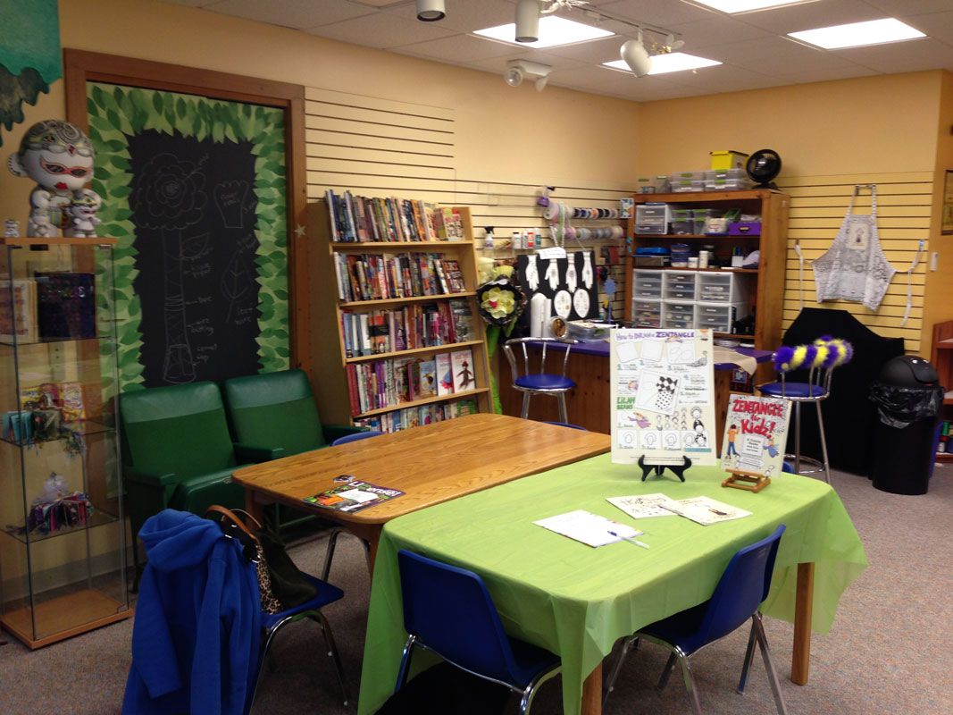Going back out to the front shop/studio space, there is a little "lounge" area with comfy chairs and a K-cup machine - since I don't know how to make coffee, you can make it yourself. There is a giant Zentangle on lokta paper on the wall. Sets the mood, no?