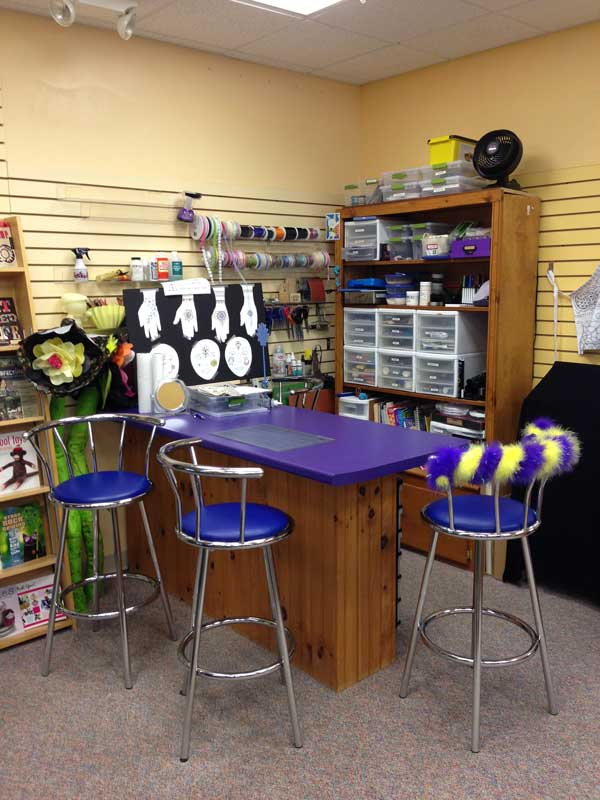 And here is the Art Bar for demos, face painting, shrink plastic... this is my favorite spot. Notice the little bookcase shrouded in black? This technique of hiding things behind curtains could become a crutch. Sooner or later I will have to actually clean all this stuff up!