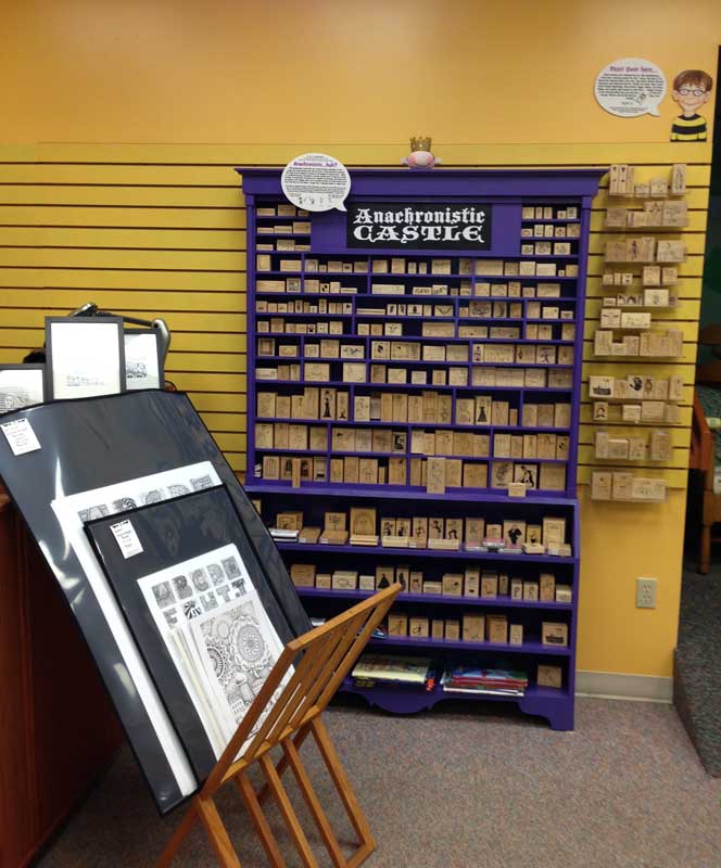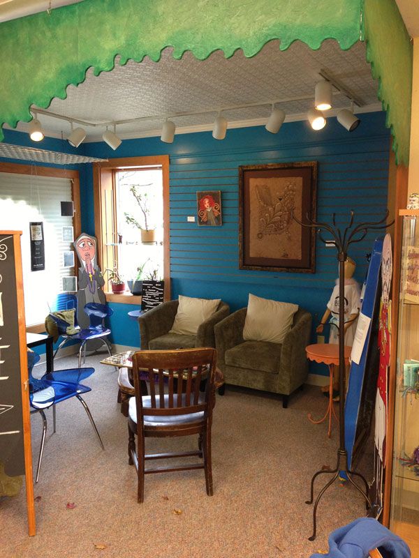 The green theater chairs in front of the giant chalk board are from a closed theater in Concord, NH. The giant Munny (Meg) on the cabinet is for inspiration, not for sale, but the books are for sale. There is definitely a lot of inspiration around here.