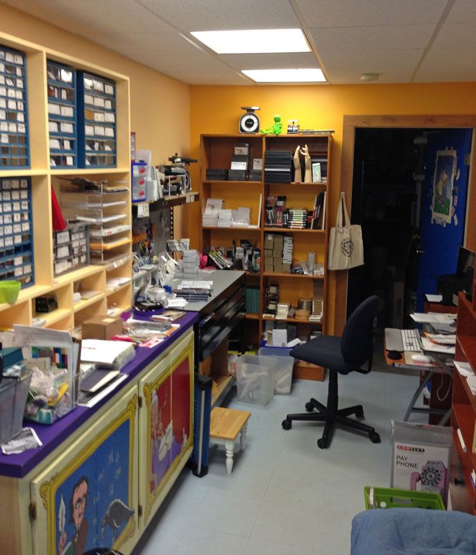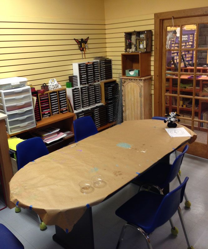 This is part of the classroom. The neat part. Although this table is currently covered by a Playmobil zoo... if I turned around I would fall over all the "stuff" we shoved into this space for the Open Studio. On the far wall, you can see half my Accucut die collection. I have two die cutters and a bunch of other cool art-toys. Yes, you too can come play in my studio!