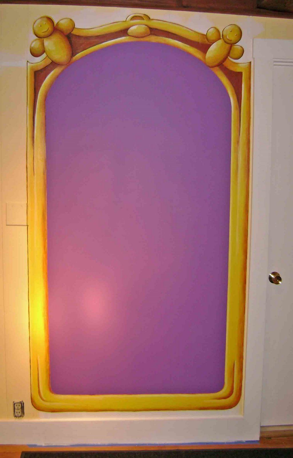 I had the kitchen door walled over, so that blank space screamed "Mural!" to me. The rest of the waiting room (I prefer "lobby") is decorated (by my neighbor) in typical country style. So I thought I'd make my presence known with a huge purple chalkboard and a golden frame with bees. It is still in progress. I was very excited to discover that, not only does Krylon make brushable chalkboard paint, but they also make "tint-able" chalkboard paint!! So I didn't have to settle for black - I got BeezInk purple. Awesome!