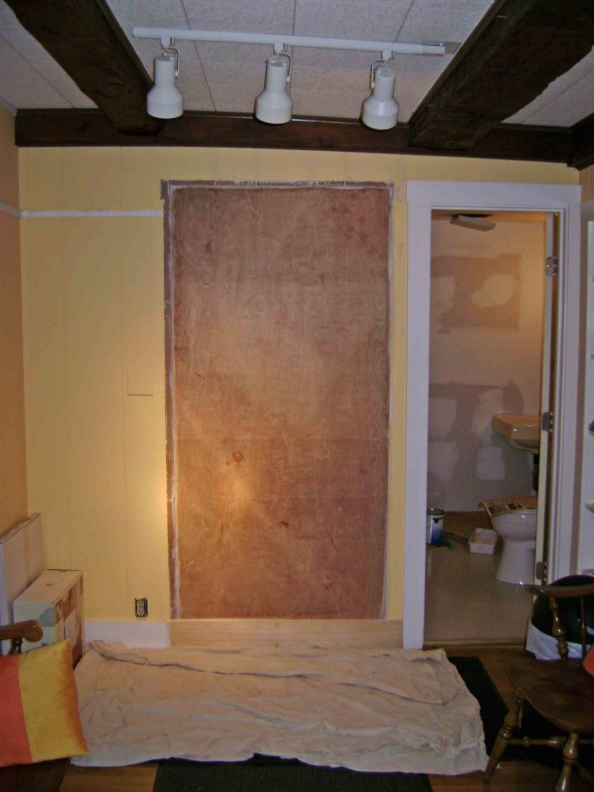 I really want to get in there and start making it my own space before I lose all motivation and hibernate instead. I've been working on some parts outside of the studio - but only after working hours. My "neighbor" has office hours and appointments with people sitting in the waiting room, so I don't want to get in their way. I painted the teeny bathroom sky blue. We used to call it the Brady-Bunch Bathroom because of the 70's color scheme and the brown trim and brown pineapple wallpaper! It took three coats of Kilz to cover the pineapples! I painted the ceiling, walls, everything , blue and I plan to add some cloud artwork later.