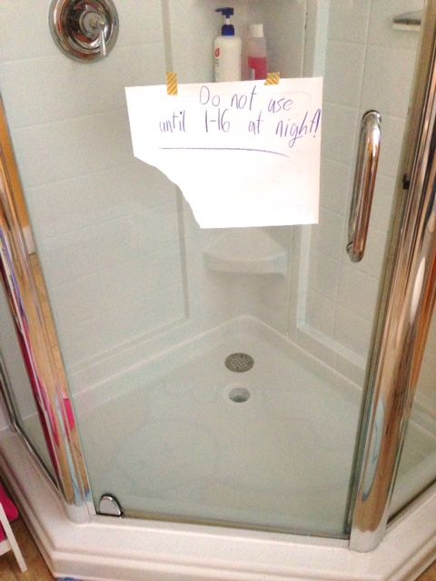 Forgot to show you this other thing my fireman did for me. He scraped the black, mildewed caulking out of the "new" shower, cleaned it, and re-caulked the whole thing. That man is so romantic. Lilah helped by writing the warning sign.