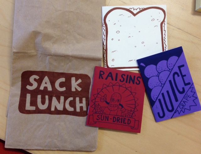 A screen printed brown paper bag held three mini-comics...