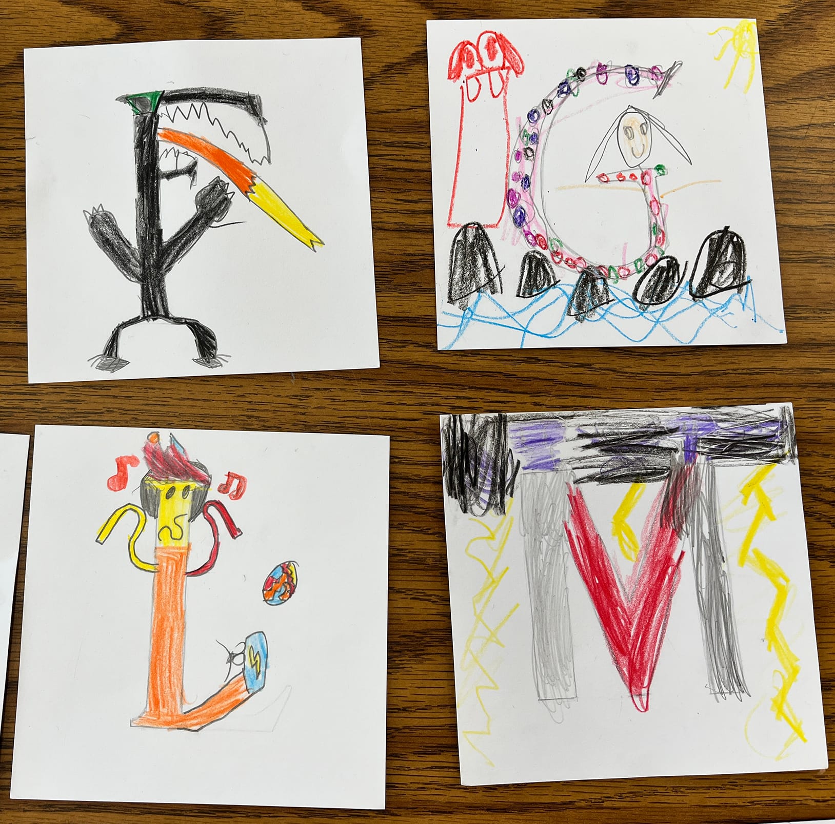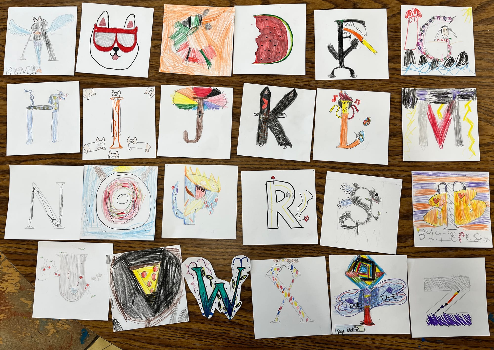 Besides the workshop making creatures out of junk... I also did two workshops at the Harold Martin Elementary school Art Camp where we made two alphabets into creatures. In other words, we made creatures... out of letters!