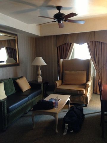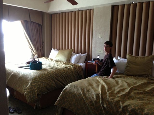 We are staying at The Biltmore Hotel which is covered with tangles and rumored to be haunted. Cool. The room left us speechless. There was a giant chair in the living room and huge, poofy, royal looking beds. Alex had been expecting to sleep on the fold out sofa, so he was beyond thrilled to get a bed that is "as wide as I am tall". Seriously, Alex is tall!