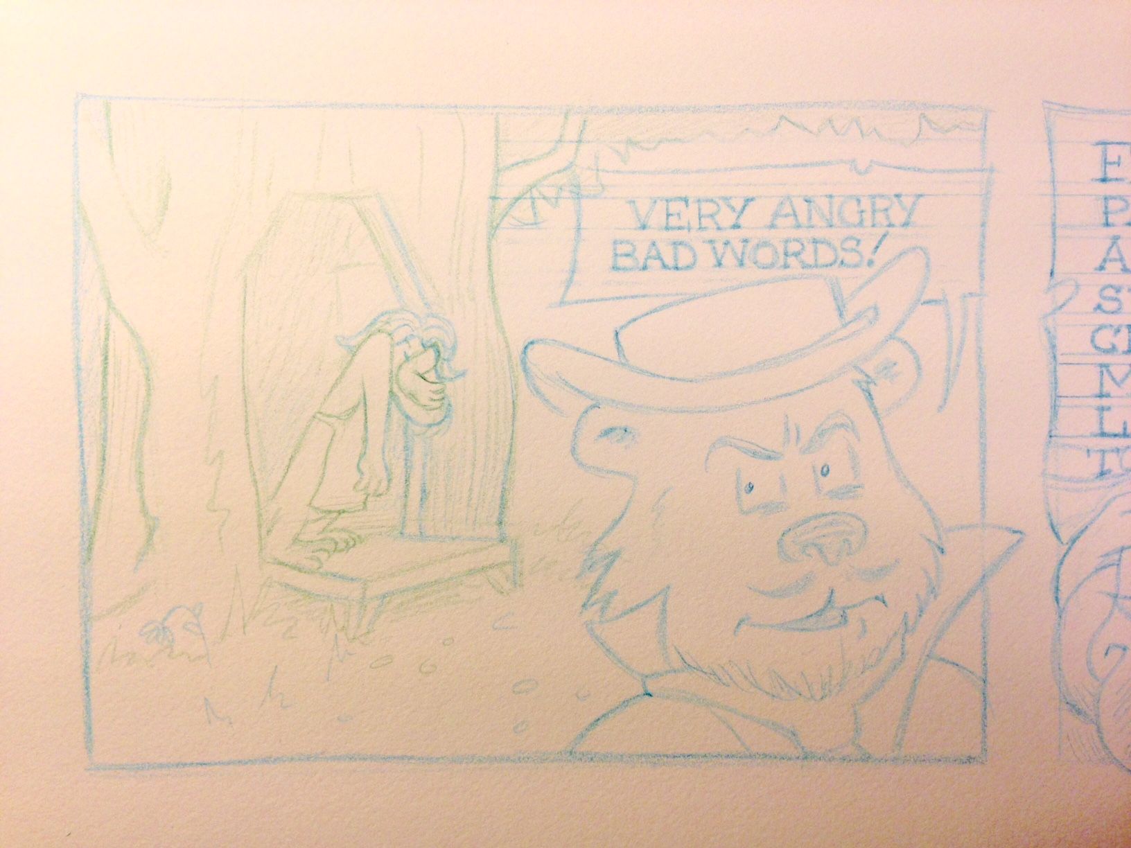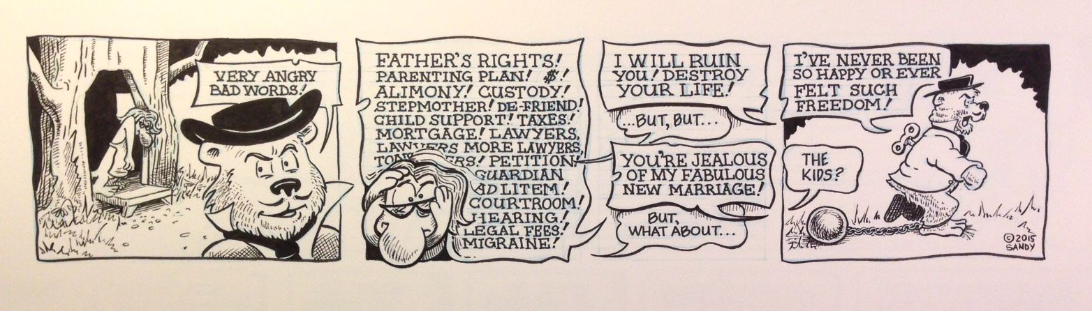 I had already used myself as the Albert the alligator character (below), so I kept it for this one too. You can probably figure out who the bear is? I created hime from a bunch of different Pogo characters and I made up his dialog lettering based on a typewriter look.