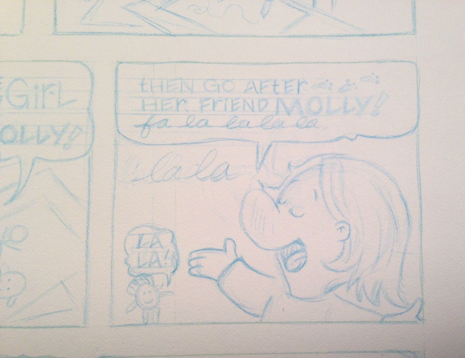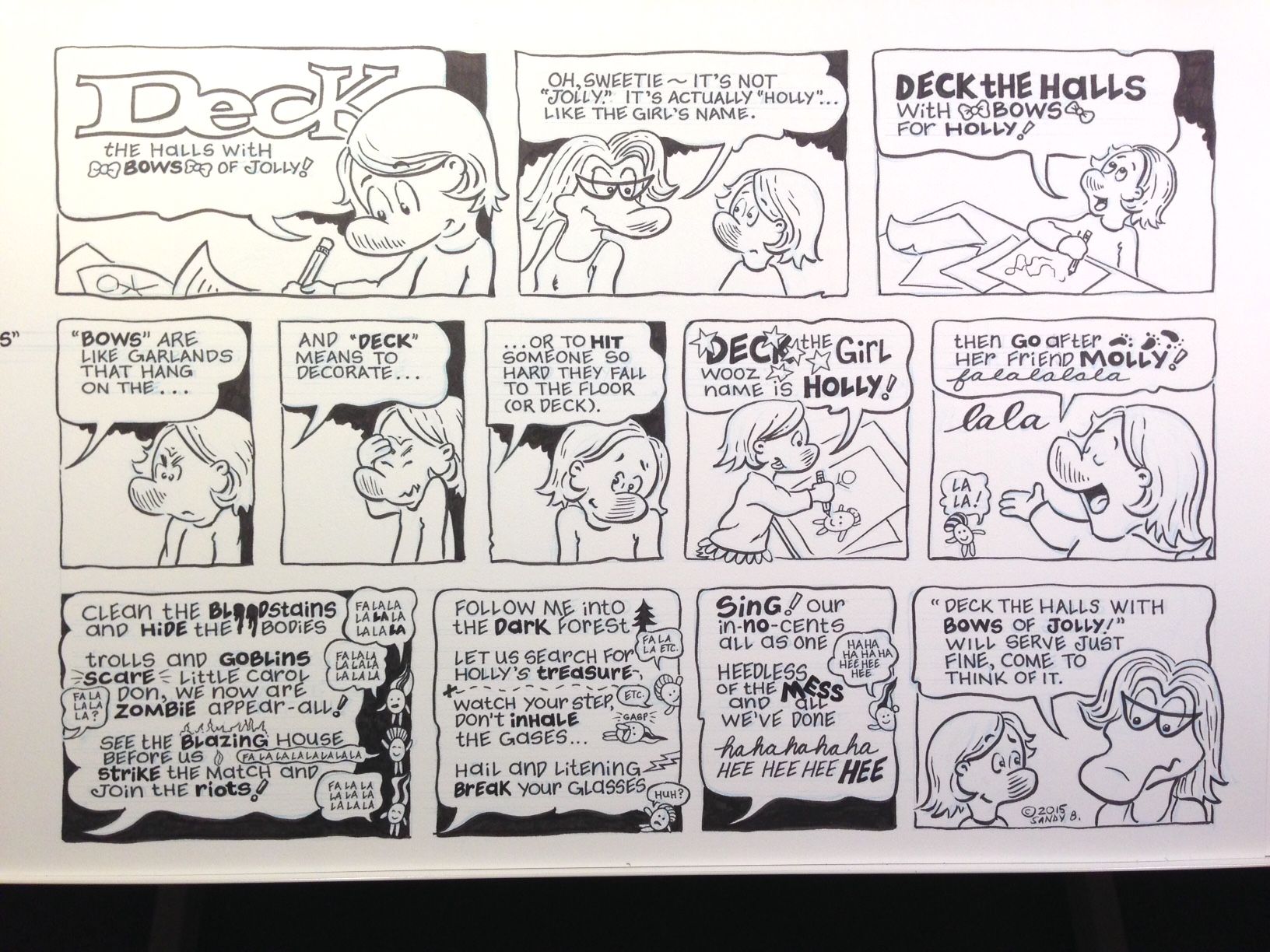 For the one above, I drew a "title" to spoof the "Pogo" title. I turned my daughter into a girl-Pogo. And I created a lettering style for her voice. This really DID happen, but the Alligator mom person is not really my personality. After all, I HELPED Lilah write the new song. She put it on her blog too. I'm trying to decide if I should add cross-hatching. Some of the Pogo strips had it, others were just line work. And I'm going to add a row of "fa la la las" under the title section (in that weird blank space).