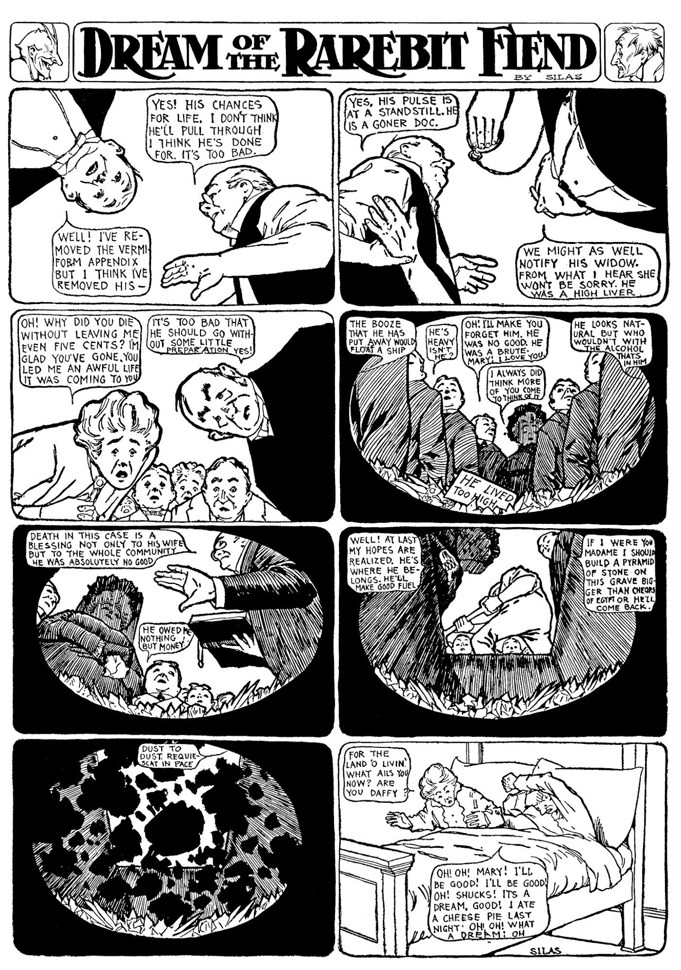 And then we got an intro to Winsor McCay. His series (signed "Silas"), "Dream of the Rarebit Fiend," were bizarre and intriguing - and you can see how they led to Little Nemo in Slumberland. "Rarebit" is like cheese fondue on toast (so we were told) and is a very heavy, bad snack to have before bed. All the strips were about the idiots who ate it, went to bed, and the horrible dreams they had!