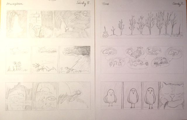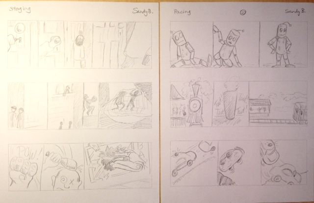 We explored "Staging," "Pacing," "Atmosphere," "Time," and "Dialog." For each strip, Jason would give a short description, and then we'd have 5 minutes to brainstorm and draw the strip. For example, for Time - "five seconds in the life of a bird." Can you find that one?
