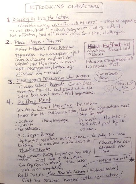 We had about 20 minutes for lunch break - I ran home - feeling very wobbly, swallowed a yogurt, and ran back. The running was good - it kept me awake for the afternoon class. Steve took pity on us and didn't make us do anything except listen while he explained the different ways to Introduce Characters in our comic books. This was really interesting... I have many pages of notes and a big list of books and movies to watch! Movies are great to study for inspiration for comic books and Steve showed us lots of clips... from Rear Window, two versions of Pride and Prejudice, Man from the South, King Kong, Dracula, Once Upon a Time in The West...