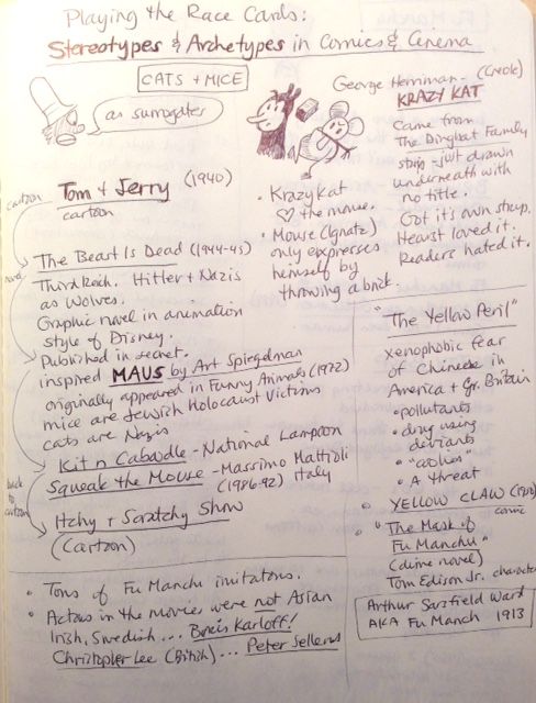 He talked about how cats and mice, starting with Krazy Kat by George Herriman, served as stand-ins for other ethnicities. And there was a strange progression with stereotypes from comics (Krazy Kat) to cartoons (Tom and Jerry), to novels (The Beast Is Dead, about the Third Reich), to comics (MAUS by Art Speigelman, about the holocaust) and Kit n Caboodle, Squeak the Mouse and then back to cartoons (The Itchy and Scratchy Show).