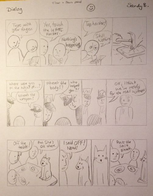 After a short break, with cookies (less than 3 hours sleep and cookies for breakfast... uh-oh) - we did a series of fast comic strips for over an hour. I can't believe I was able to focus and come up with ideas, but it was kind of soothing in a way.