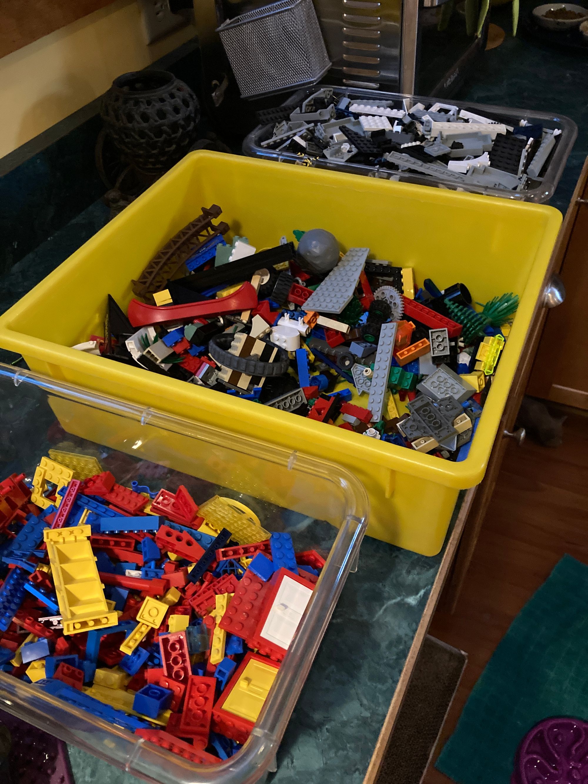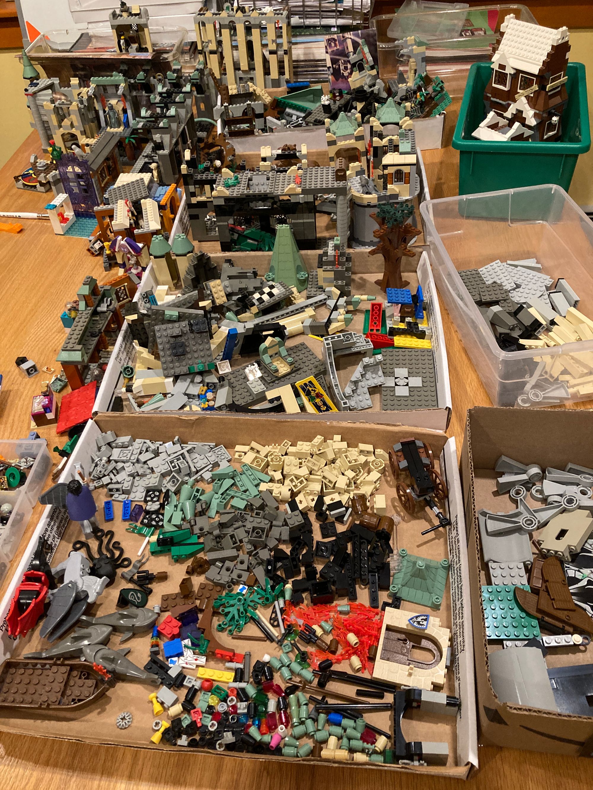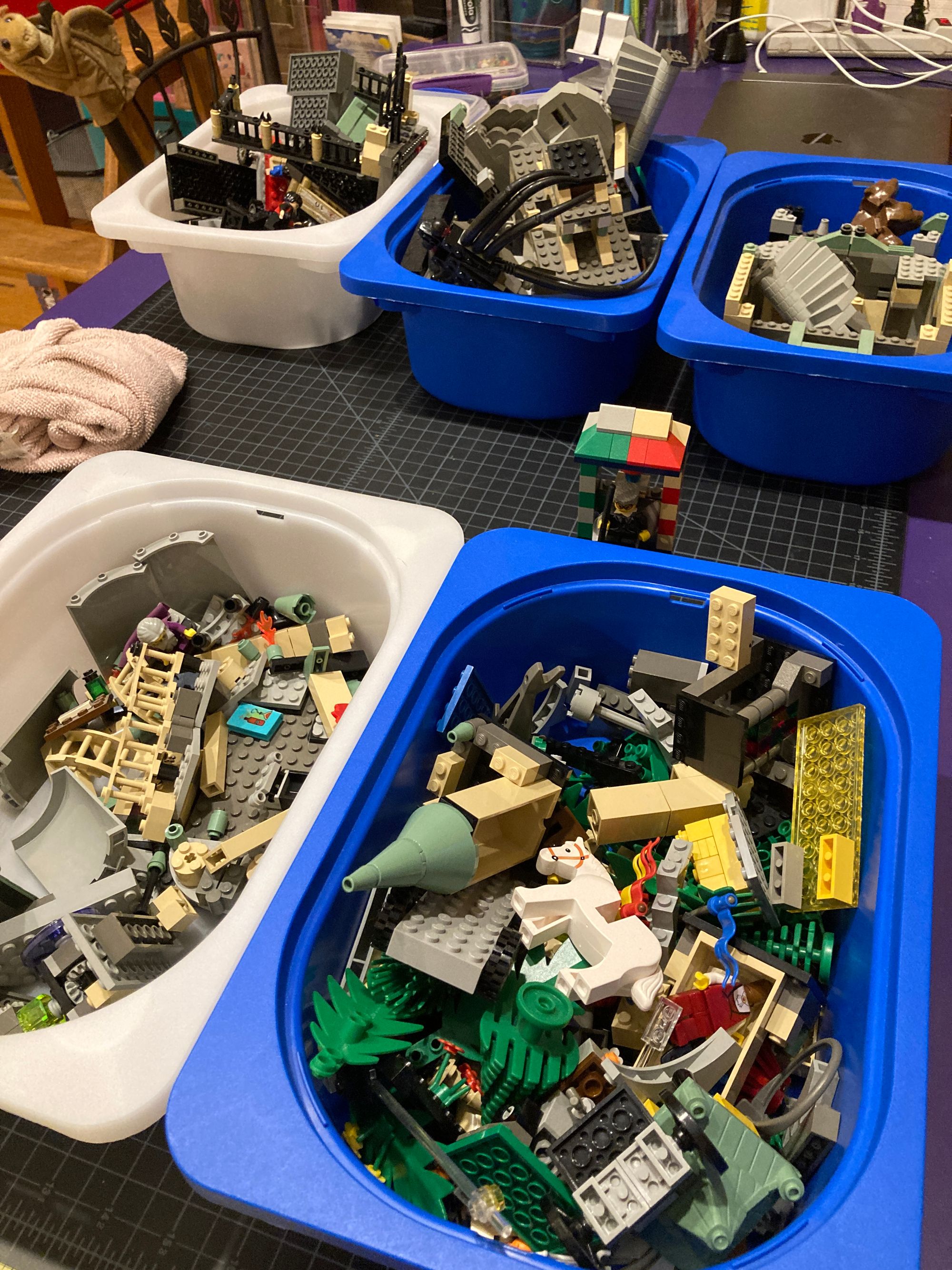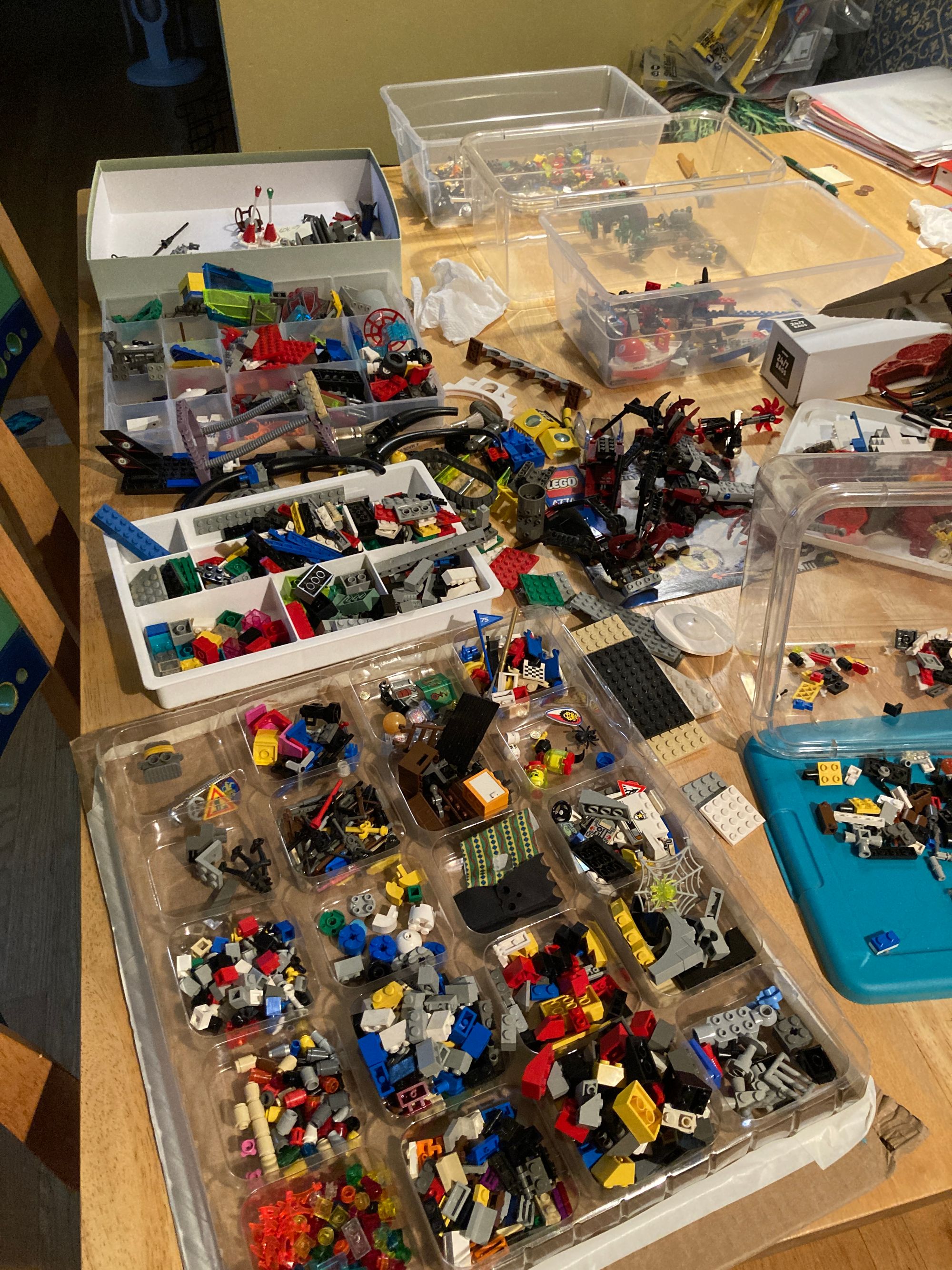 A friend came to help me yesterday. We were able to "almost" complete about three sets. We stuck them into big ziplock bags with a post it note listing what's missing. I realized I needed to actually sort all the (TEN!?) bins of loose LEGO pieces. There were some really gross things at the bottoms...