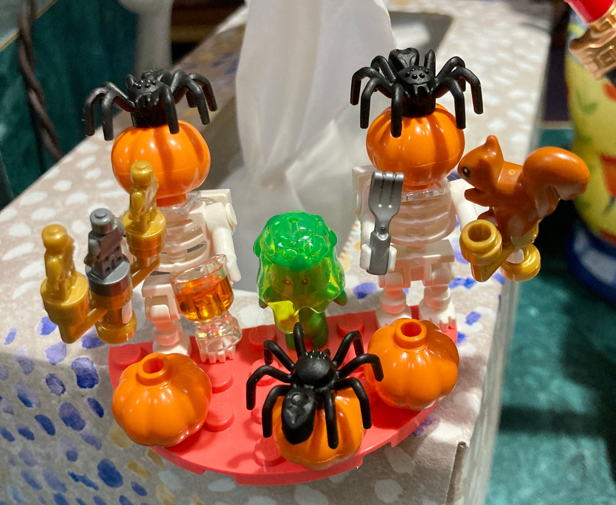 I was so inspired to build nightmares, I raided my "extras" and made some pumpkin-headed skeletons. One is drinking butter beer and basking in the glow from its Oscar candelabra. The other is about to eat a squirrel? What the fork!? And the booger thing is arguing with a spider. Fun!