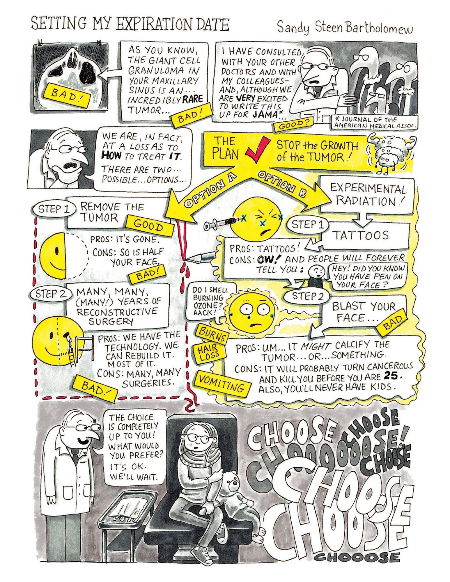 When I was about 11, doctors discovered I had an extremely rare tumor that they didn't know how to treat. It wasn't quite cancer, and yet, it was growing. (I learned many years later, that the growing mass had smashed all the bones in my orbital floor). I had a bunch of biopsies and tons of CT scans - but then I had to decide between two unlikely methods of treatment (see the comic above). I chose the experimental radiation. It was very new at this time and had way more CONS than PROS. But an Expiration Date of age 25 was still more than twice my age.