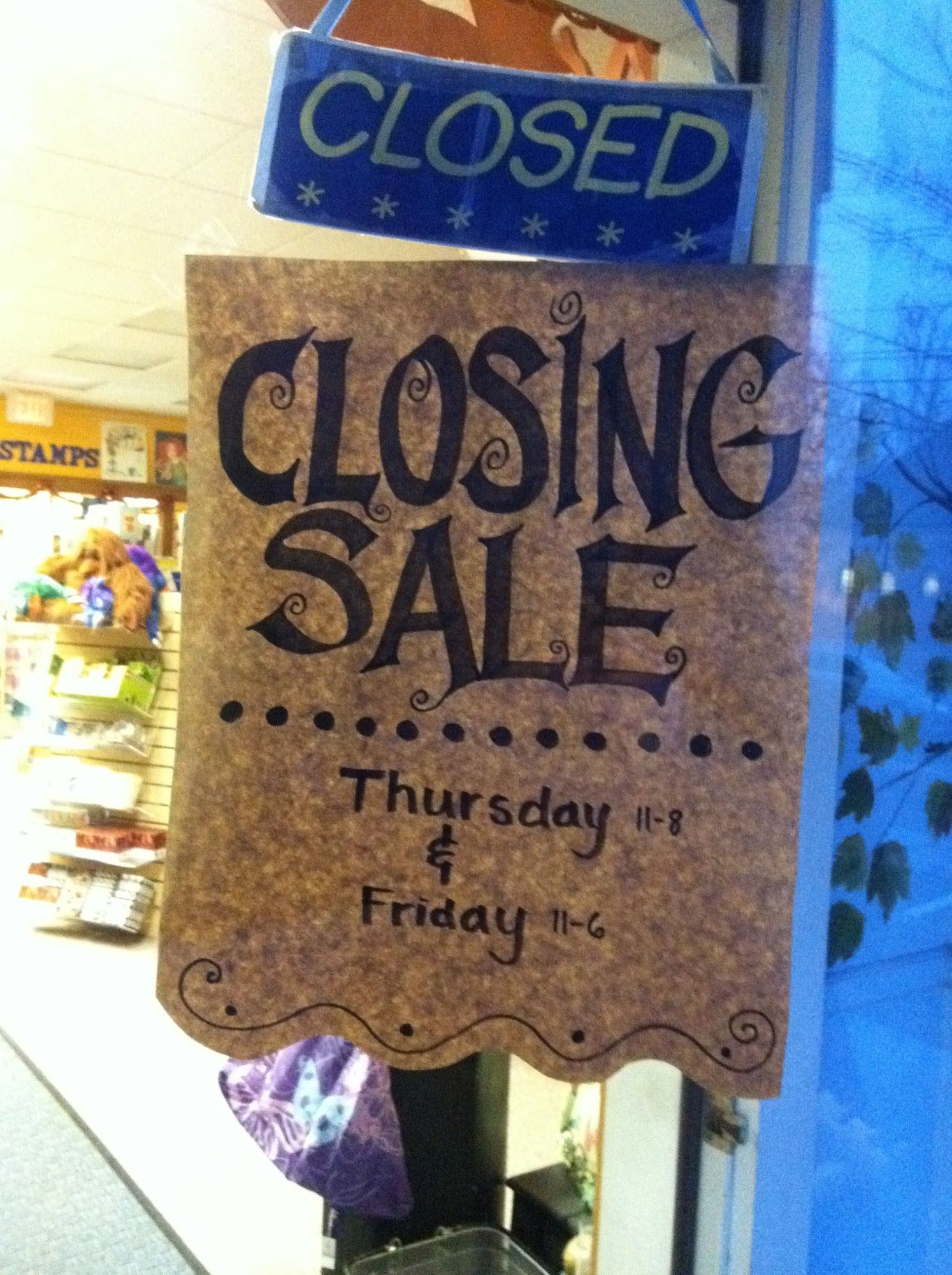 The store was starting to show some empty spots, but then I "discovered" forgotten caches of polymer clay and tape guns and toothbrushes with feet and buttocks (seriously!), MORE rubber stamps and... finger puppets. I can't believe no one noticed a huge Rubber Maid box FILLED with little bars of Sculpey in the back room? Two days? There's still so much to sell off.
