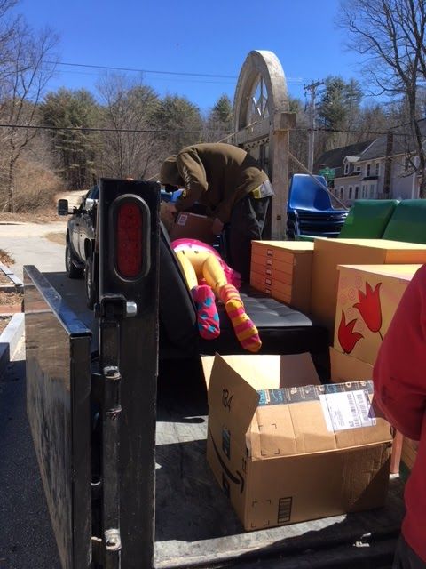 And today we moved lots of displays, bookcases, books - TWO trips to Concord! Even my life-sized mannequins were transported. The younger one rode in my passenger seat, but the older one sprawled on the sofa in the back of the truck - rather indecently!