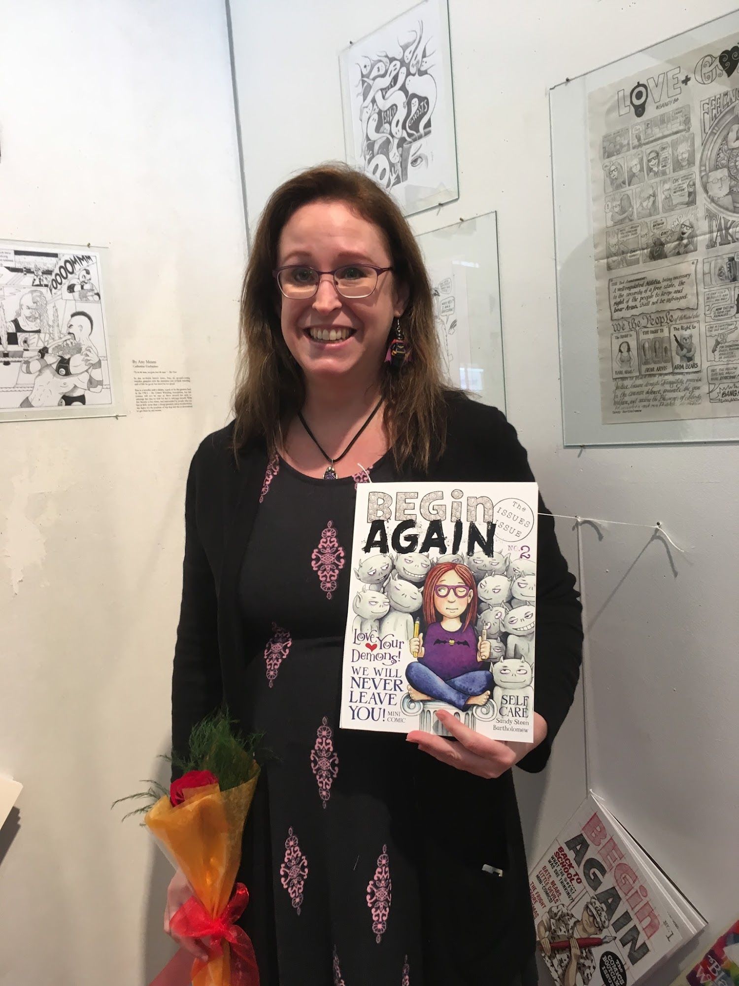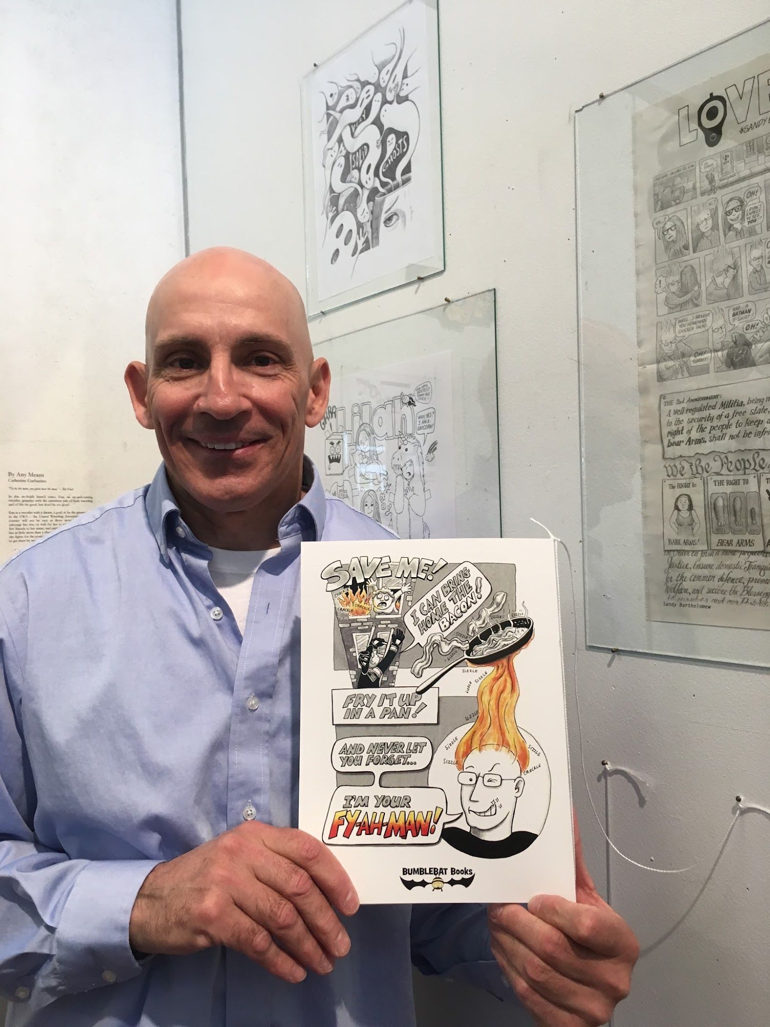 The Fireman! holding an issue of BEGIN AGAIN with a comic ad for HIM.