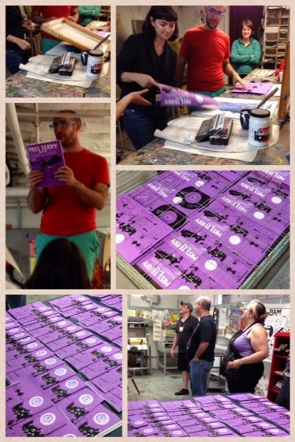 When we returned, it was to learn about silkscreening the covers. They had been photocopied onto purple paper and then we screen-printed the white letters and details on top. The white glows in the dark!!! How cool is that?