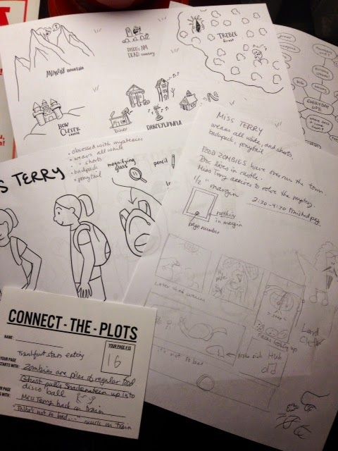 Next, we were given some characters, the main one being Miss Terry, a young sleuth, as well as the villain, some Zombie food invading the Danceylvania town, and the title... "Miss Terry and the Midnight Snack". And then we were each assigned a page number (I was 16 - that's the last page of the comic!) We ALL brainstormed and worked our way through each page determining where each page began and ended in the plotline. The best part happened when the teachers all "performed" the story back to us. It was so funny - I wish it had been videotaped.