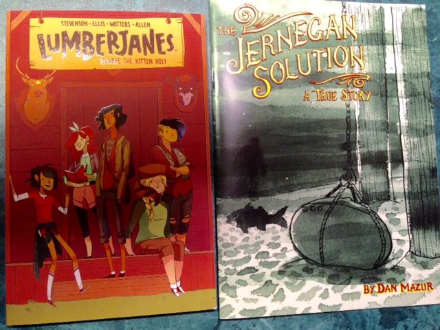 LumberJanes by Noelle Stevenson (who was a Visiting Artist at CCS last fall). And the Jernegan Solution by Dan Mazur (who also wrote one of the Comics History books we read for school).The Jernigan Solution is about true events that happened in Lubec, Maine in 1898 - a "gold factory" con!