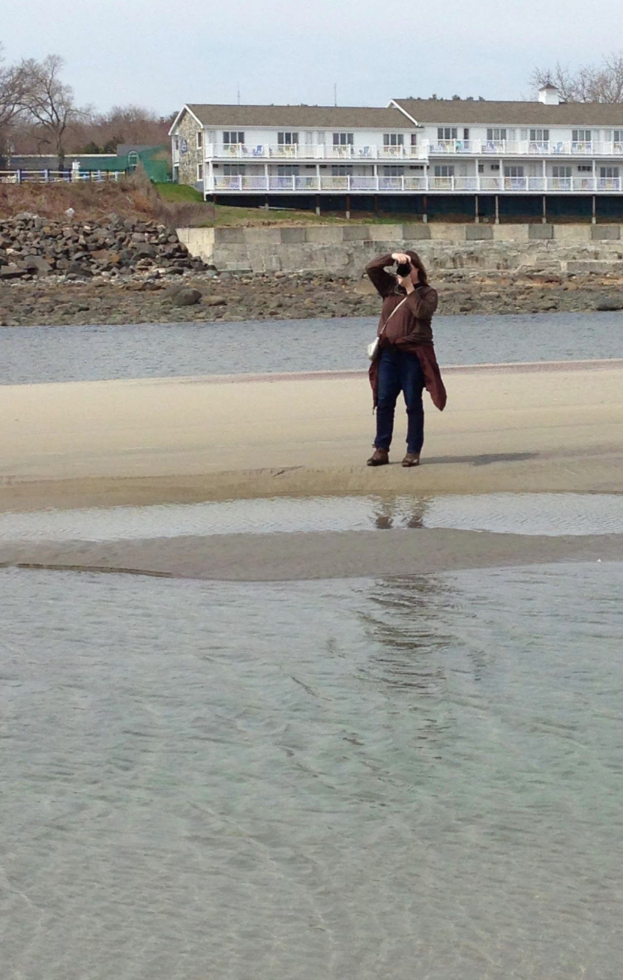 We got our kicks "shooting" each other on the beach. I think this beach is so amazing and bizarre! I'm standing on sand, but there is ocean between us, then more ocean behind Jen, then land again. A beach sandwich? Huh, maybe it's just a sand - wich?