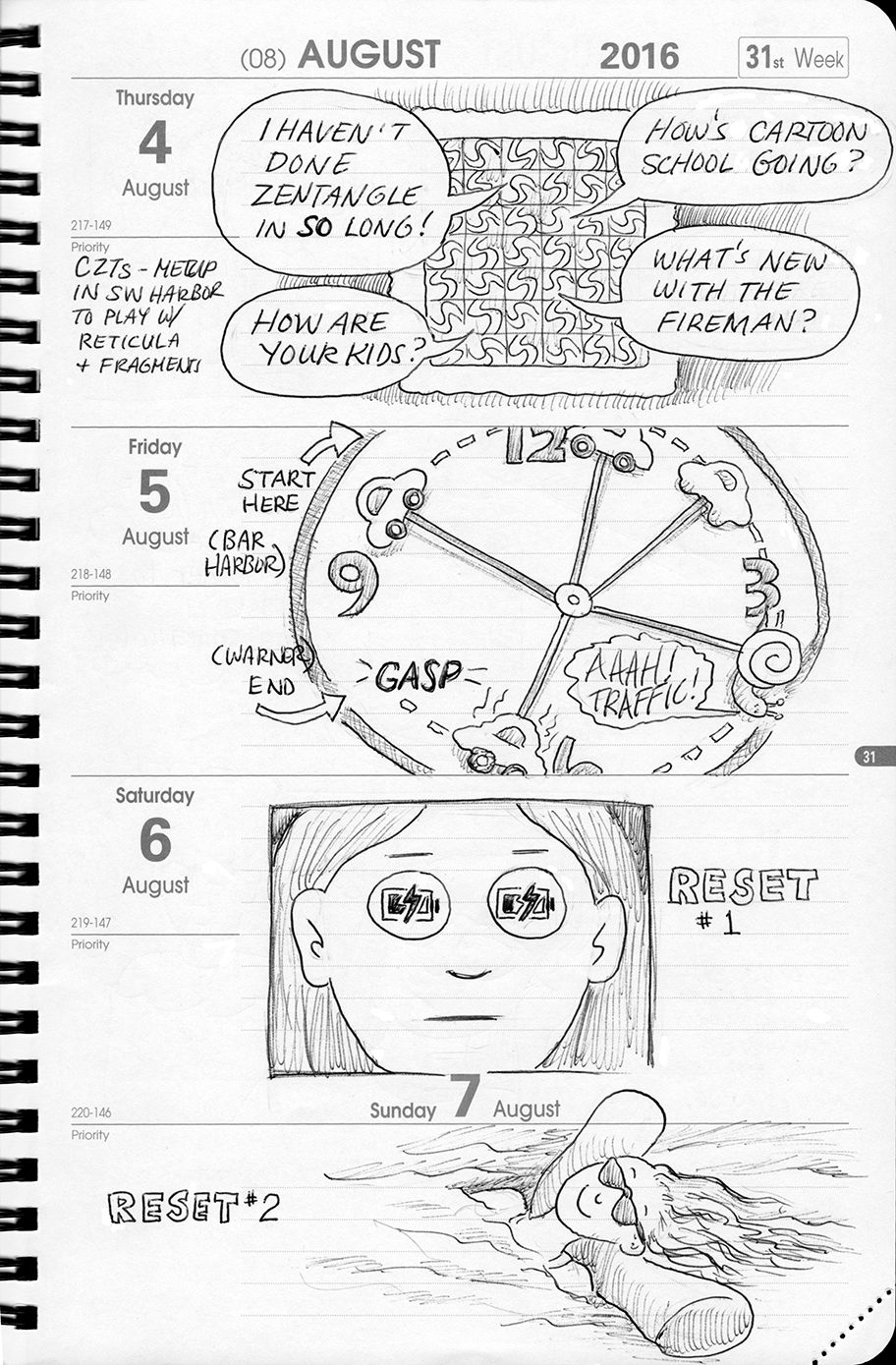 In July, I had this Genius Idea (i.e.: "what was I thinking?!"). I would force myself to draw a Cartoon-A-Day. By using a planner/journal - if I missed a day - it would be glaringly obvious.