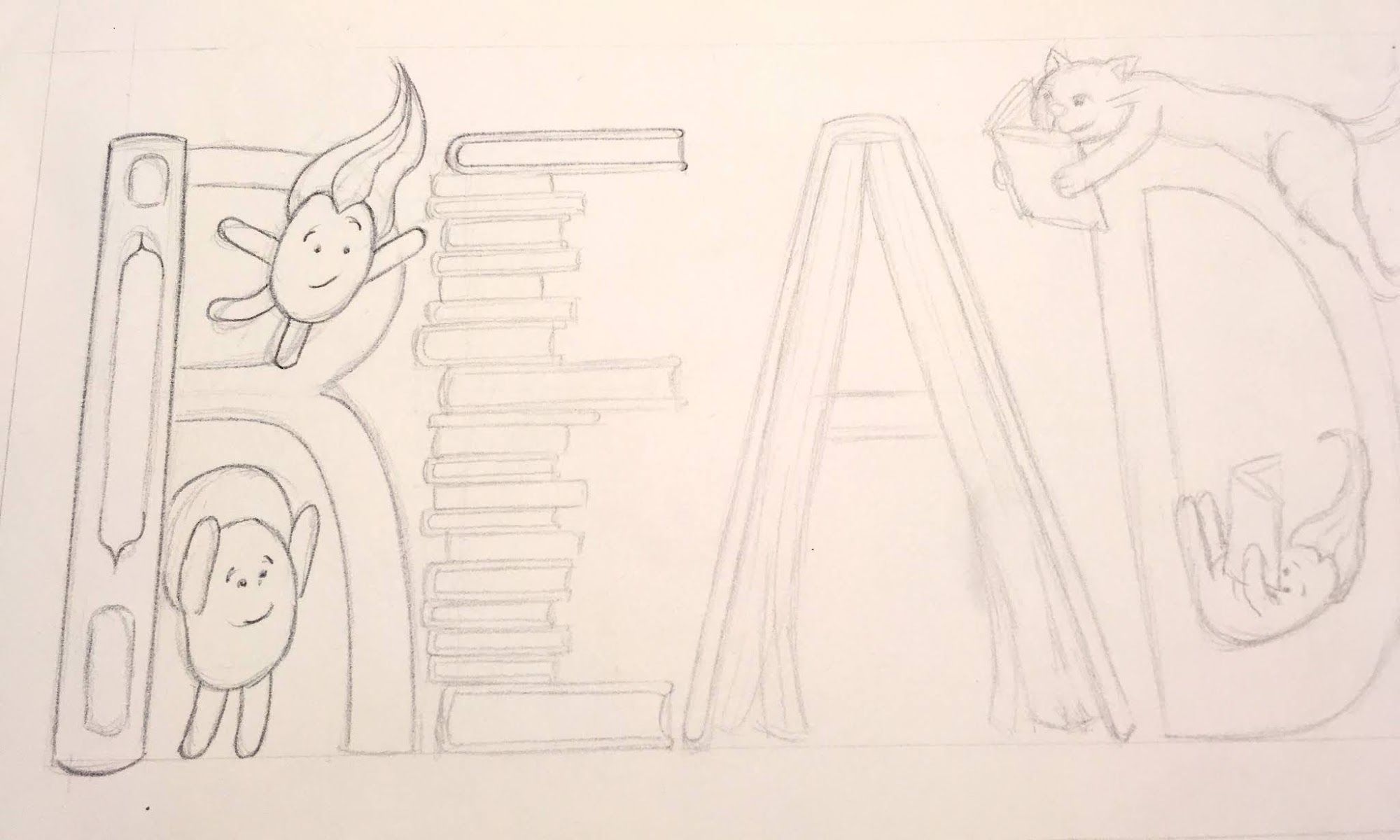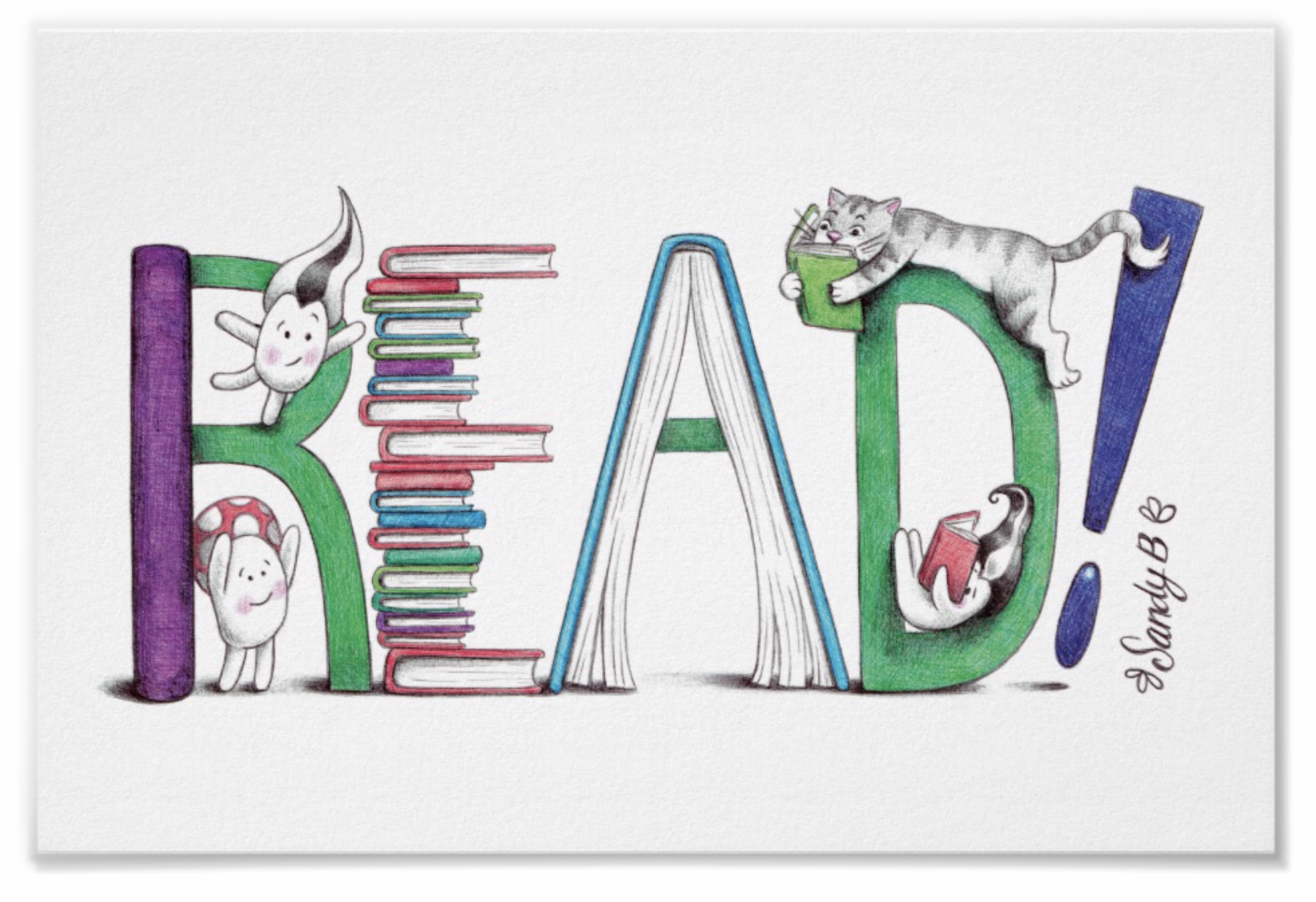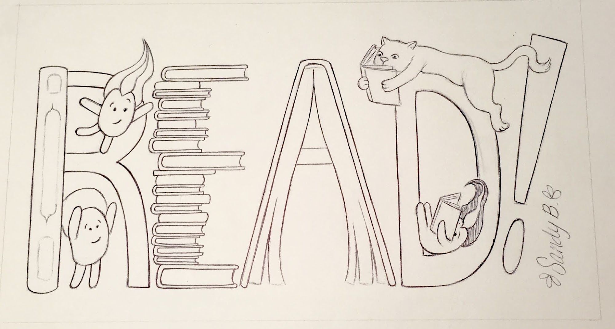 To clarify, here's another example: Let's say you are a librarian and want artwork to hang in your elementary school library... you could ask for the word "READ!" with some Lilah Beans. I would create the R-E-A-D letters made from books and stacks of books with Lilah Beans sitting on the stacks and reading other books. You could also tell me if there are particular titles you'd like on some of the books. Hmmm.... that sounds pretty cool - I may have to draw that one for myself!