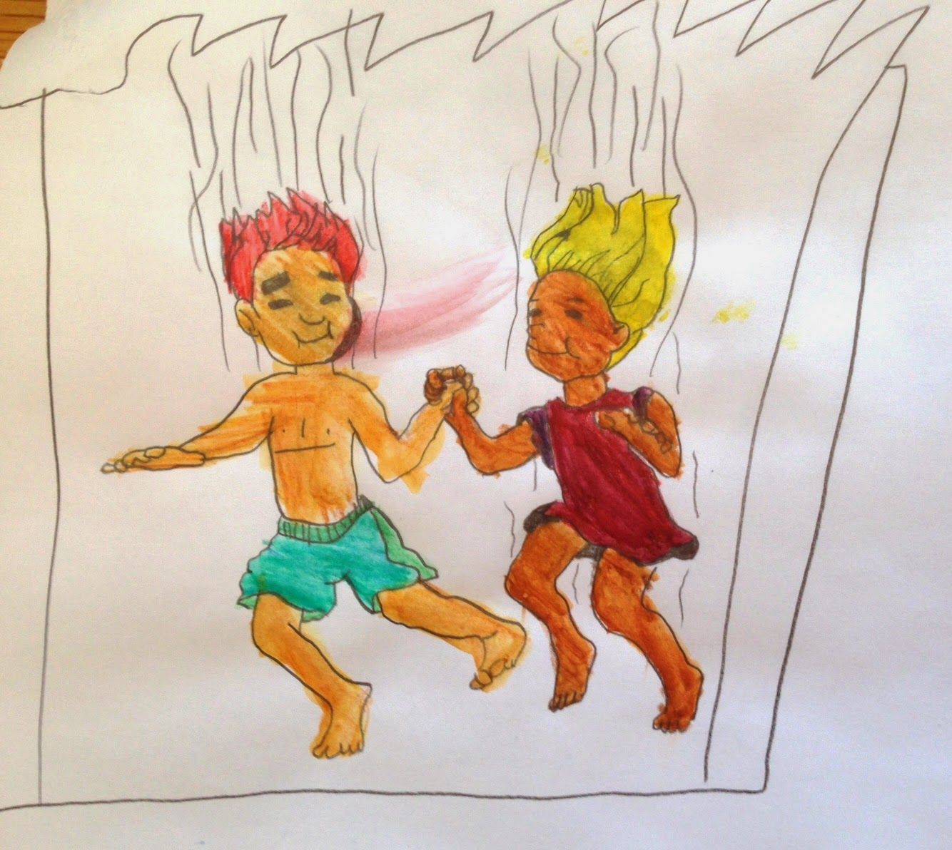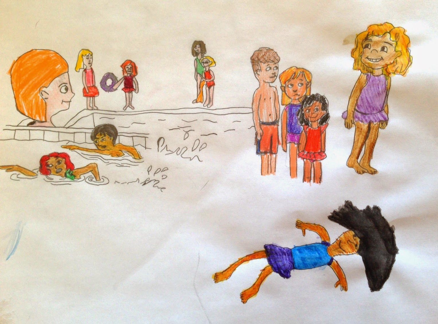 My favorite drawing is of the little girl with black hair floating in the water - at the bottom of the drawing below. She looks so happy and relaxed. That is exactly how it feels to float in a pool. Sigh.