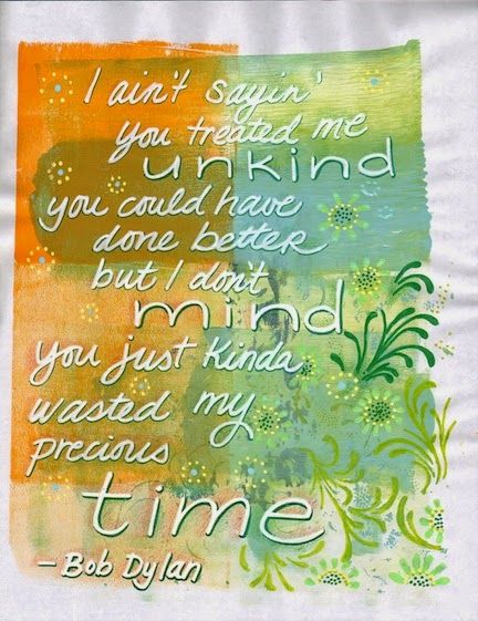 I started out thinking I'd do a Dr. Seuss quote. Then realized, I've done a bunch of Seuss quotes already. This one by Bob Dylan struck a chord. ;-) This was a cast-off Gelli print - I probably cleaned the brayer and thought it looked pretty. I never would have intentionally picked these colors to use together. I really like them!
