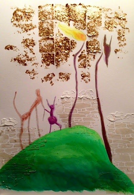 I took an old drawing from my sketchbook (done in gouache and pencil) and smeared over it all the different texture pastes I had on the shelf, through brass stencils. I used gold mica paint, modeling paste, and pumice paste. I could have done more, probably, but... eh. I keep wanting to go back to the original drawing and work more on that!
