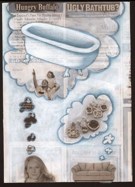 This was fun. I had no idea where it was heading... and I have no idea where I ended up! I just started drawing on a classified page - inspired by the words and photos - then painted around stuff. I guess I could have gone either way - drawing a "Hungry Buffalo" OR an "Ugly Bathtub". Ok, I whimped out - I couldn't think of what a buffalo looked like - off the top of my head. "Ugly Bathtub"? That creature I know very well! (I do wonder what exactly the dad is pointing at?)