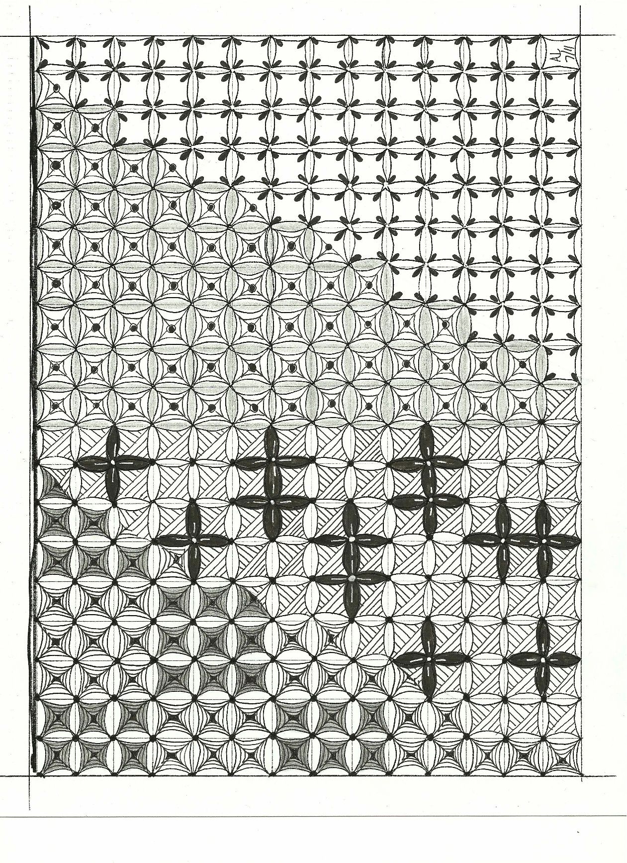 Page 32, which terrifies Anita, is a bigger challenge. This one combines different tangles to create crazy new variations. It's a TANGLE MASH-UP!!