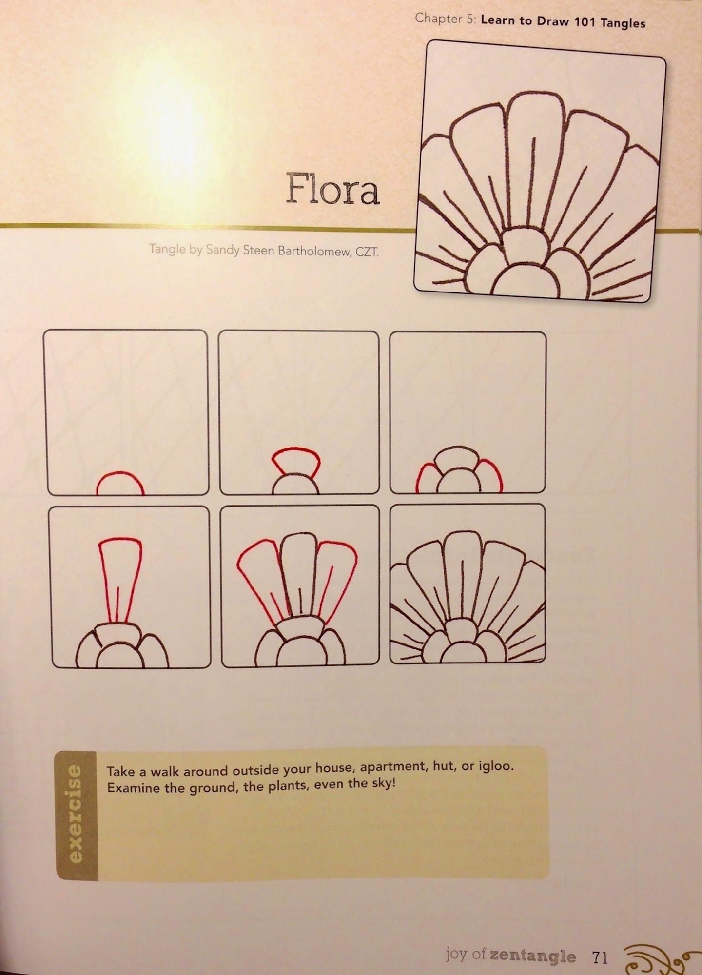 I am new to Zentangle and am working my way through the tangles in the book, "Joy of Zentangle". I am looking at your tangle called Flora. In the book it is illustrated within a small square and in the last square the petals are cut off by the edges of the square.