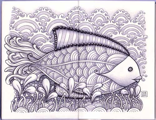This is my most recent Zentangle drawing for our ongoing WCANH Journal Challenge. The string in this book (the challenge) is the shape of a fish.