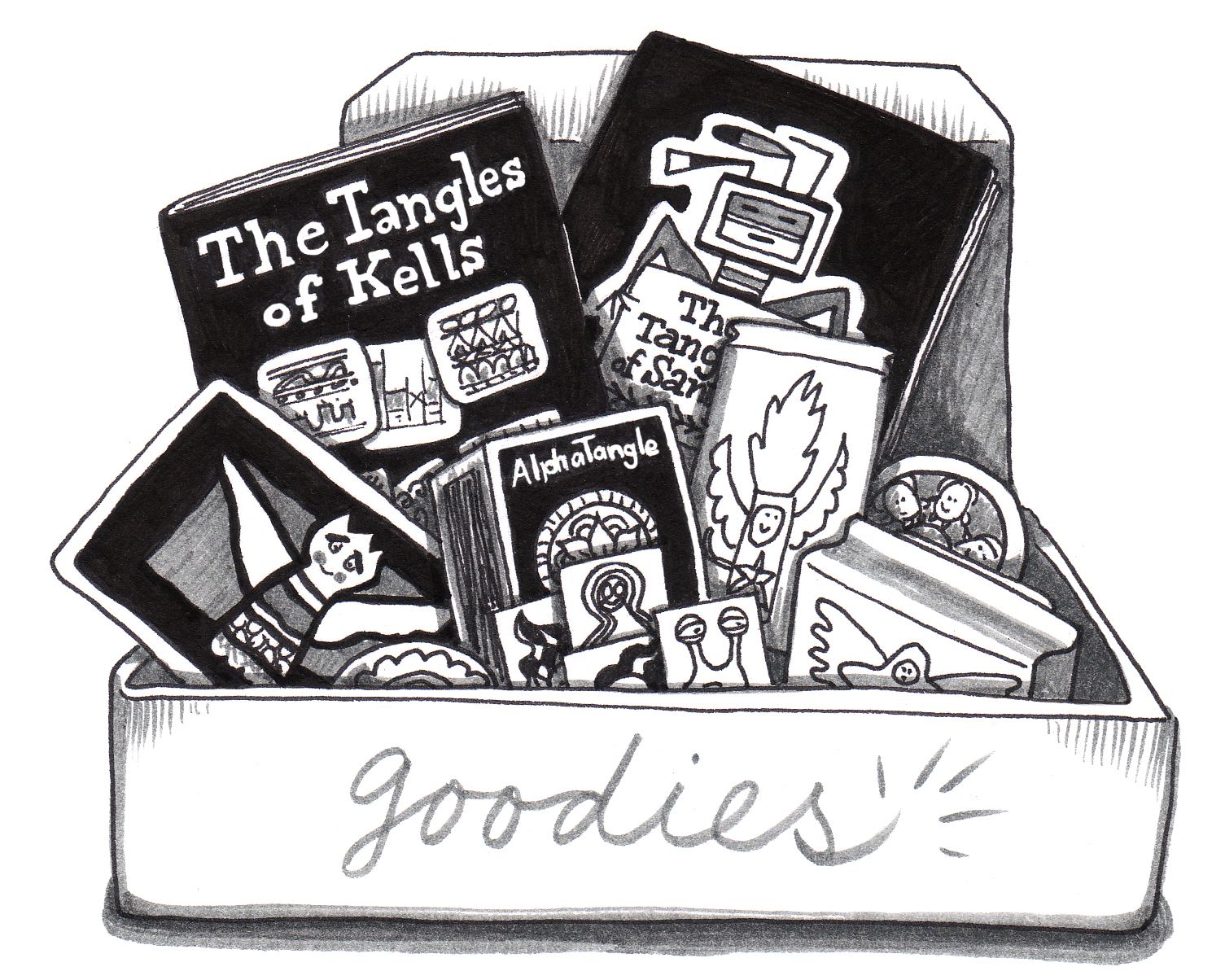 $100 - FRIENDS with GOODIES will get a little box stuffed with Stuff! Including: Signed copies of "The Tangles of Kells" and "The Tangles of Santa Fe" books, a pack of AlphaTangled cards, tattoos, stickers, pins, rubber stamps... and anything else that might fit. (I've had a lot of different businesses, so lots to choose from!) I've limited the goody boxes to 30 so I can make them really great! I expect to have these mailed out in September or October, depending on how many there are. (Only a few left!)