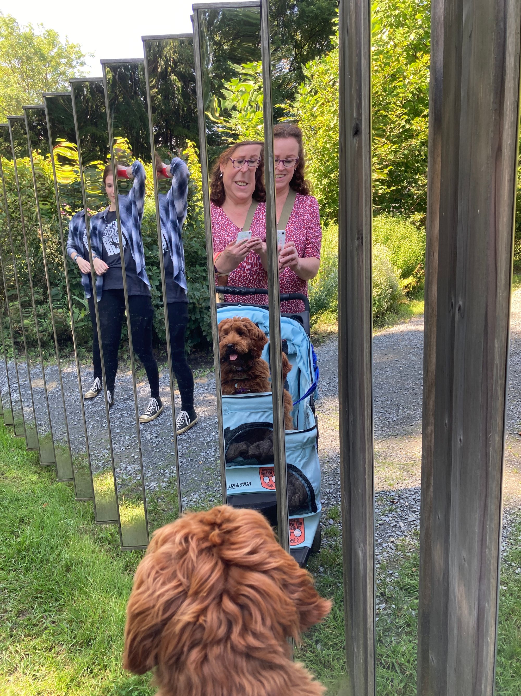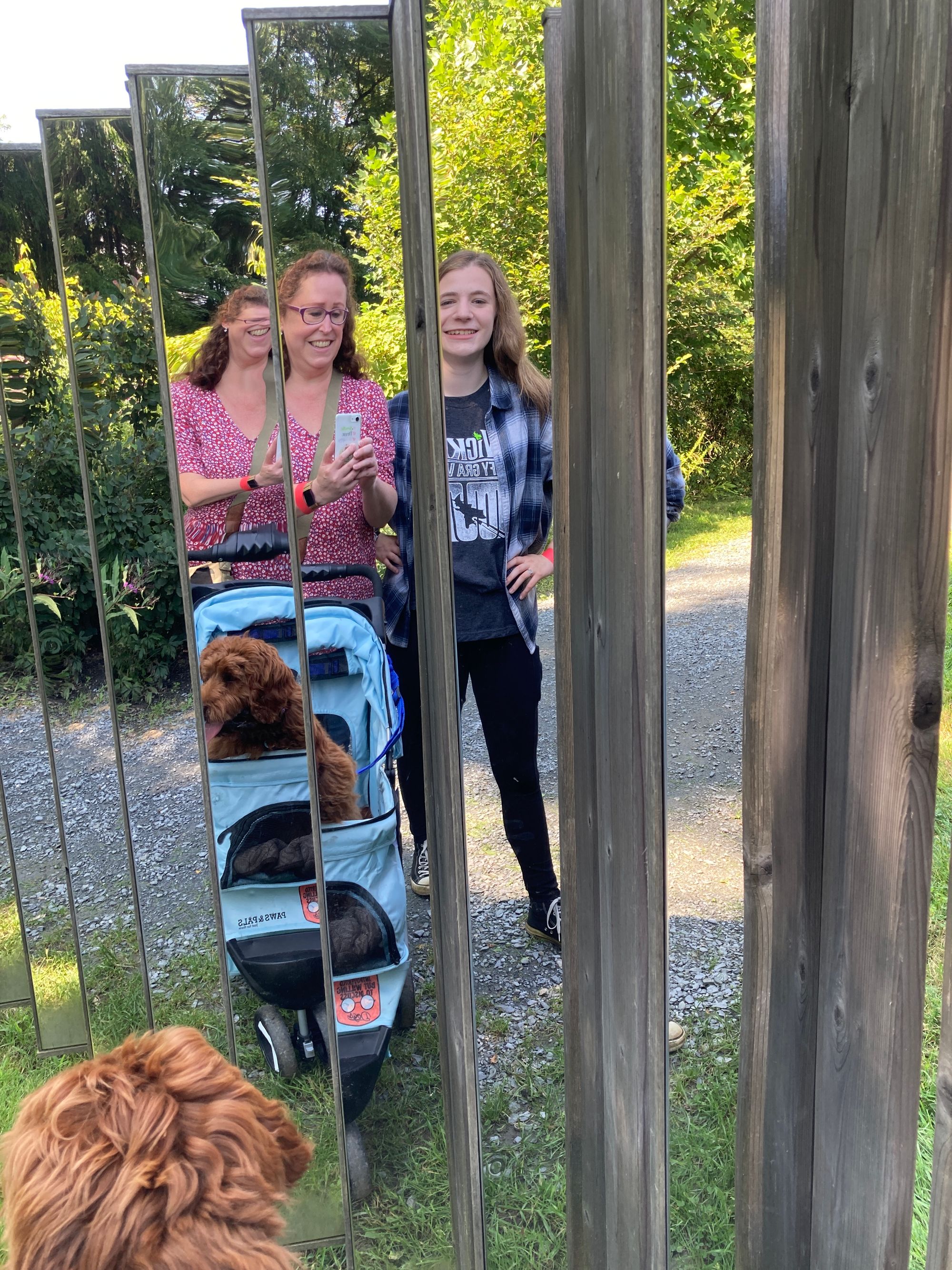 She was pretty worn out after the hike, so we popped her back in the stroller for the walk back to our car. Elsa Bear was the one who noticed this really cool mirrored fence!