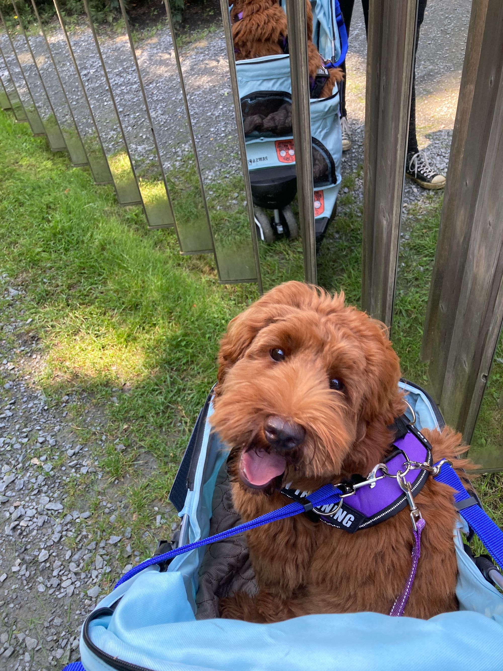 She noticed another incredibly cute puppy looking at her - and it was also in a stroller! She kept turning her head as she passed the puppy - until we realized she was watching herself in the mirror!
