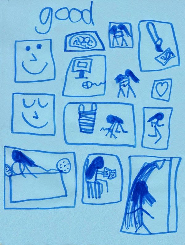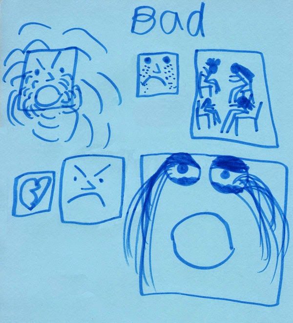 Those are my BAD Apps. Her App Icons are more expressive than mere titles could be, but I will try to label them. She explained that these are programs that we might do or someone might do to us: Yelling, Sad, Arguments (I love the gestures!), Broken Heart, Angry, Despair (Crying Your Eyes Out).