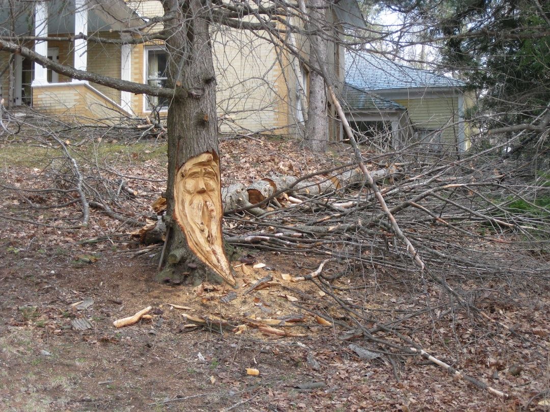 Yesterday, the sun was shining, but the whole town was oozing sadness because of Rosa's memorial service to be held that night. There was even a news van stationed in front of town hall. And the wind was blowing so hard stuff was flying around Main Street. As I trudged back home, the wind flying down the mountain was so strong, I actually had to turn my back to it in order to breathe! As I turned, my eye was caught by some extreme tree damage to a neighbor's property. Big branches down. My cranky brain said "Bummer of a clean up job. I wonder why they haven't gotten started yet." But as I started to turn back into the wind, my artist's eye discovered WHY they hadn't cleaned up yet. (No, not baby birds! That's way too cute!) This neighbor had seen the possibilities in the destruction and "carved" them out! And if the annoying, cold wind hadn't forced me to turn around, I wouldn't have ever known that this neighbor was creative and had a sense of humor!