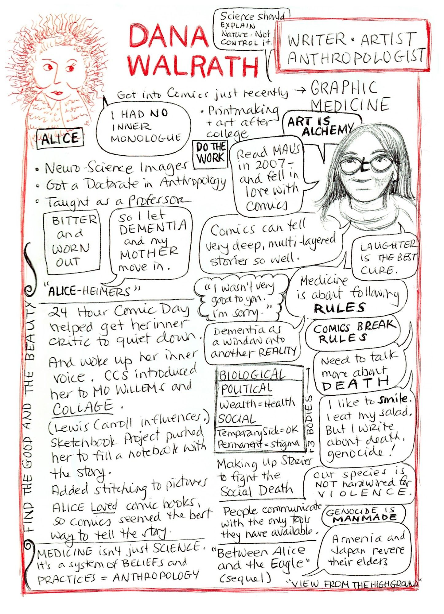 The first half of her presentation was about how she came to comics from her science background. After burning out in academia, she created an incredible mixed-media comic book about Dementia. Based on her experiences and stories while caring for her mother (Alice) the book is called Aliceheimer's - Alzheimer's Through the Looking Glass: